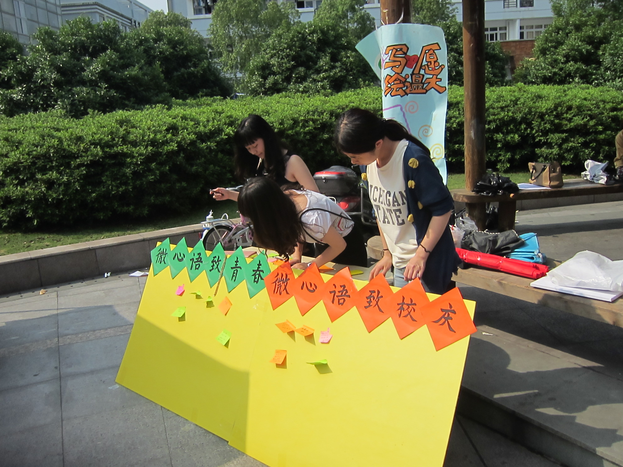 此外,支部还设计了两个微心语板块,分别是“致校庆”和“致青春”。支部提供了便签纸和水笔,热情地邀请过往的行人对“校庆”和“青春”留下自己的祝福和寄语。一边,灵动的墨迹不停地在纸上飞舞,另一边,一张又一张真挚的致词出现在留言板上,微心语的板块由此变得热闹非凡。