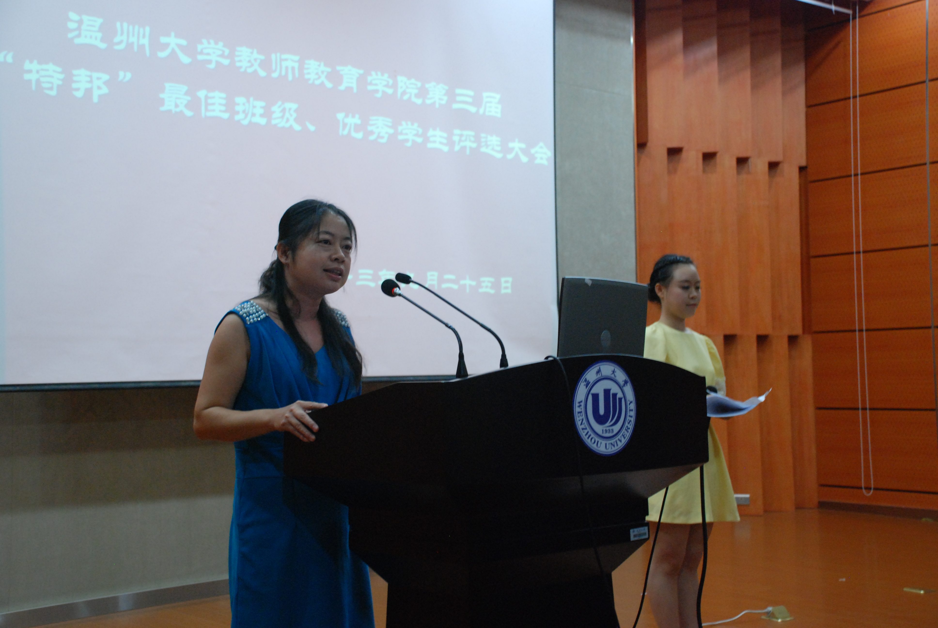 首先进行的是“特邦”最佳班级的评选。参加评选的班级有10小教科学、10学前本、10小教中文、11教技、11小教中文、11小教数学和11应用心理学等七个班级。各班的代表人都对自己班级的学习氛围、专业技能、所获得各类团体先进奖项和班级建设做了全面介绍,并着重介绍了自己班级所独有的特色。各班的展示充分展现了学院优良的学风,各班讲解的同学和台下相呼应的同学们紧密配合,也全面展现了班级的凝聚力和创造力。