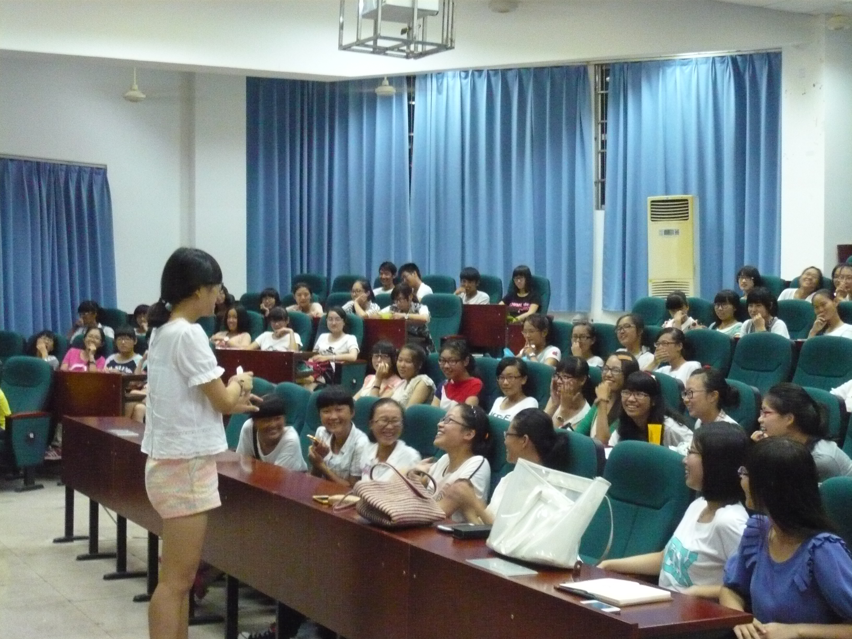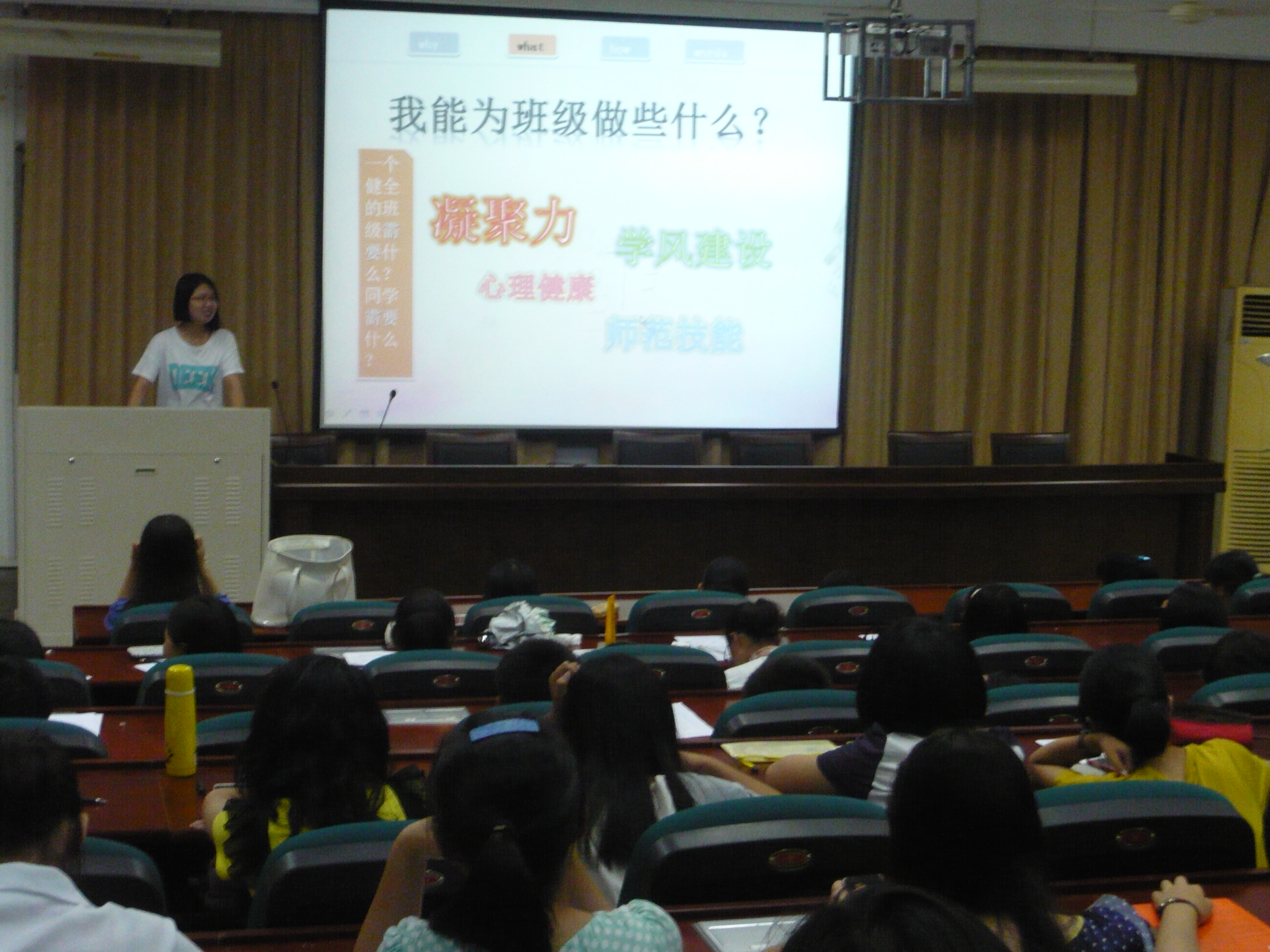 黄央央学姐根据自己多年担任班级团支书的经历,向13级新生们传授了许多自己在班委工作方面的心得与经验。主要围绕班级学风建设、班级活动、班级和个人荣誉等多个方面展开,为13级各班的班委们提供了参考范例。同时,她所在的班级也多次在学校学院的各类评比中屡获佳绩,为学弟学妹们树立了优秀的榜样。陈汀学姐则是分享了个人多年的学习经验。她以一个“吃鸭”的游戏和秀才的三个梦指明了大学新生们要“摆正心态”。其次,要有方向,无论是学习、生活、娱乐、工作上都要给自己制定明确而具体的目标,才不至于荒废大学四年。有了目标之后,要开始做规划。在小教专业学习、学习上的考级考证计划、学习方法、学习资源各方面要逐步细化目标,做好有可行性的计划。
