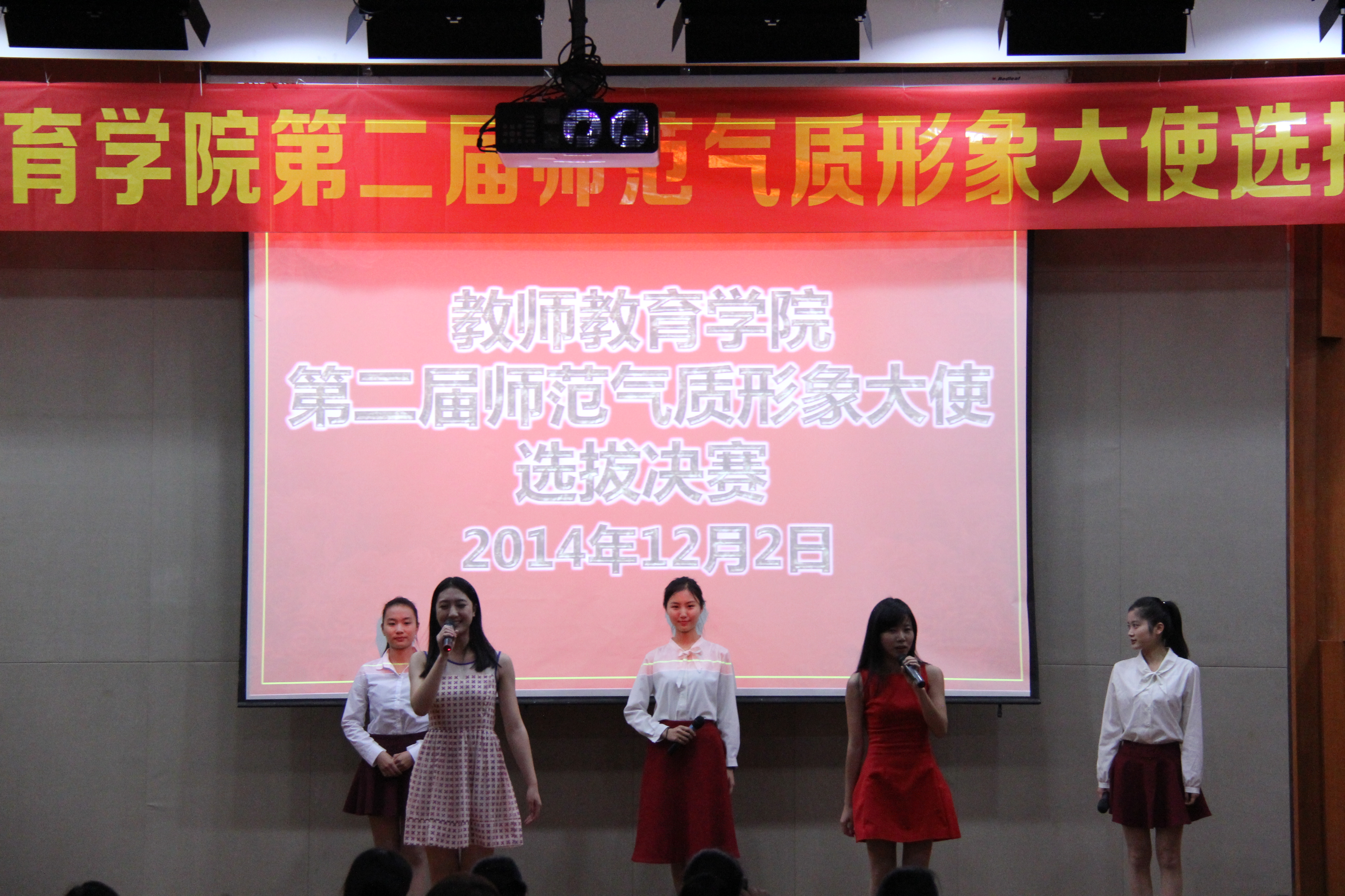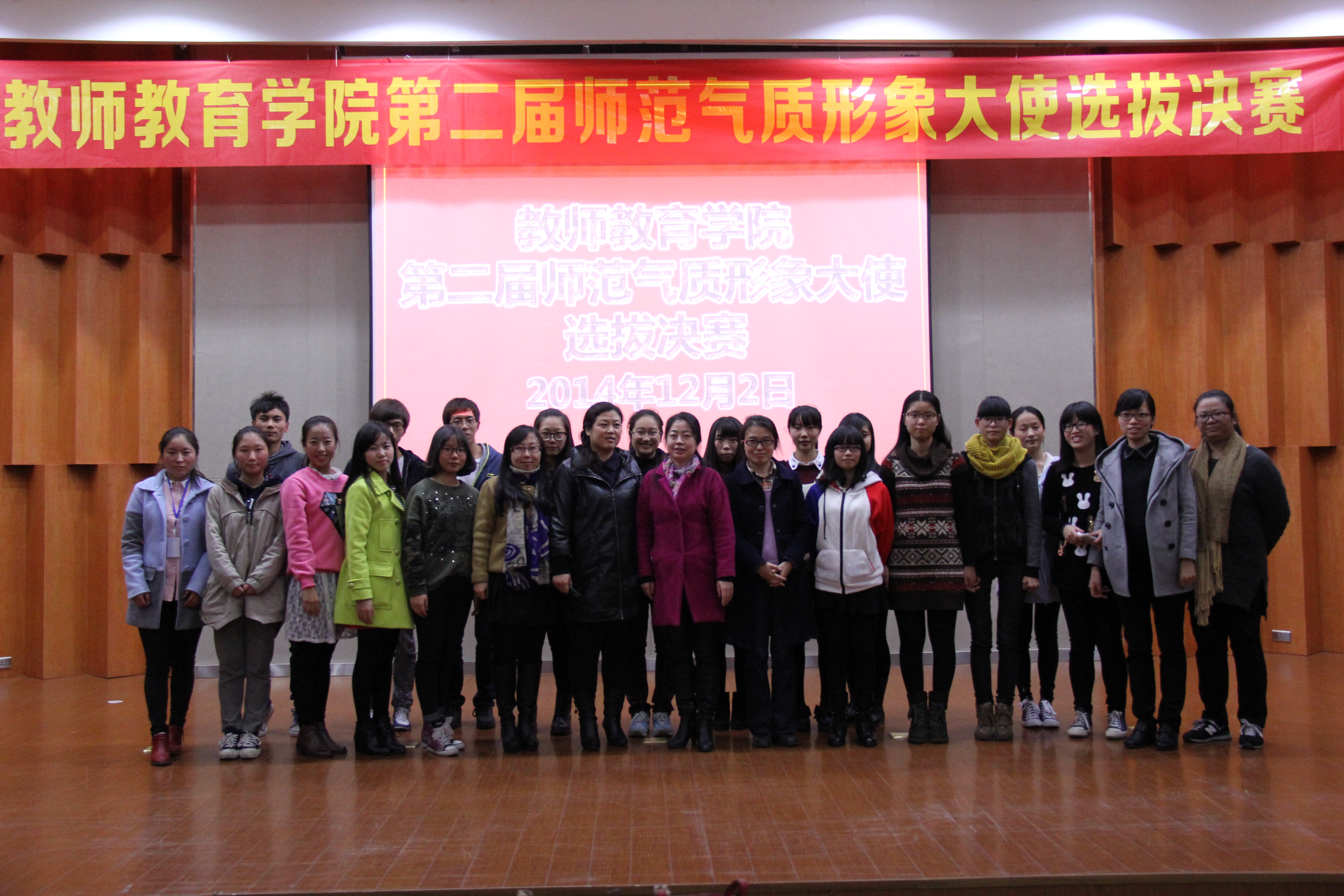 第二届师范气质形象大使选拔决赛在南校雁山厅举行。到场的嘉宾有学院党总支副书记嵇小怡老师,教技系主任张新立老师,小教系书记刘海霞老师,心理系卢佳老师,学前系杨利霞老师,以及来自泥巴影院