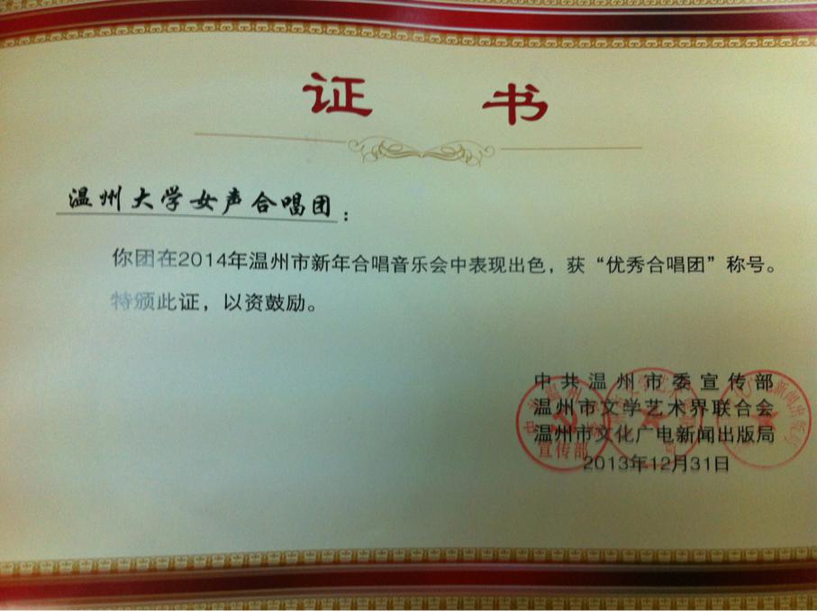 近日,一年一度的温州市新年合唱音乐会在温州大剧院举行。我校女声合唱团作为第十二届中国合唱节银奖团队在新年合唱音乐会上深情演绎了《李有松》、《走进美丽,走进神奇》两首歌曲,并荣获“优秀合唱团”称号。