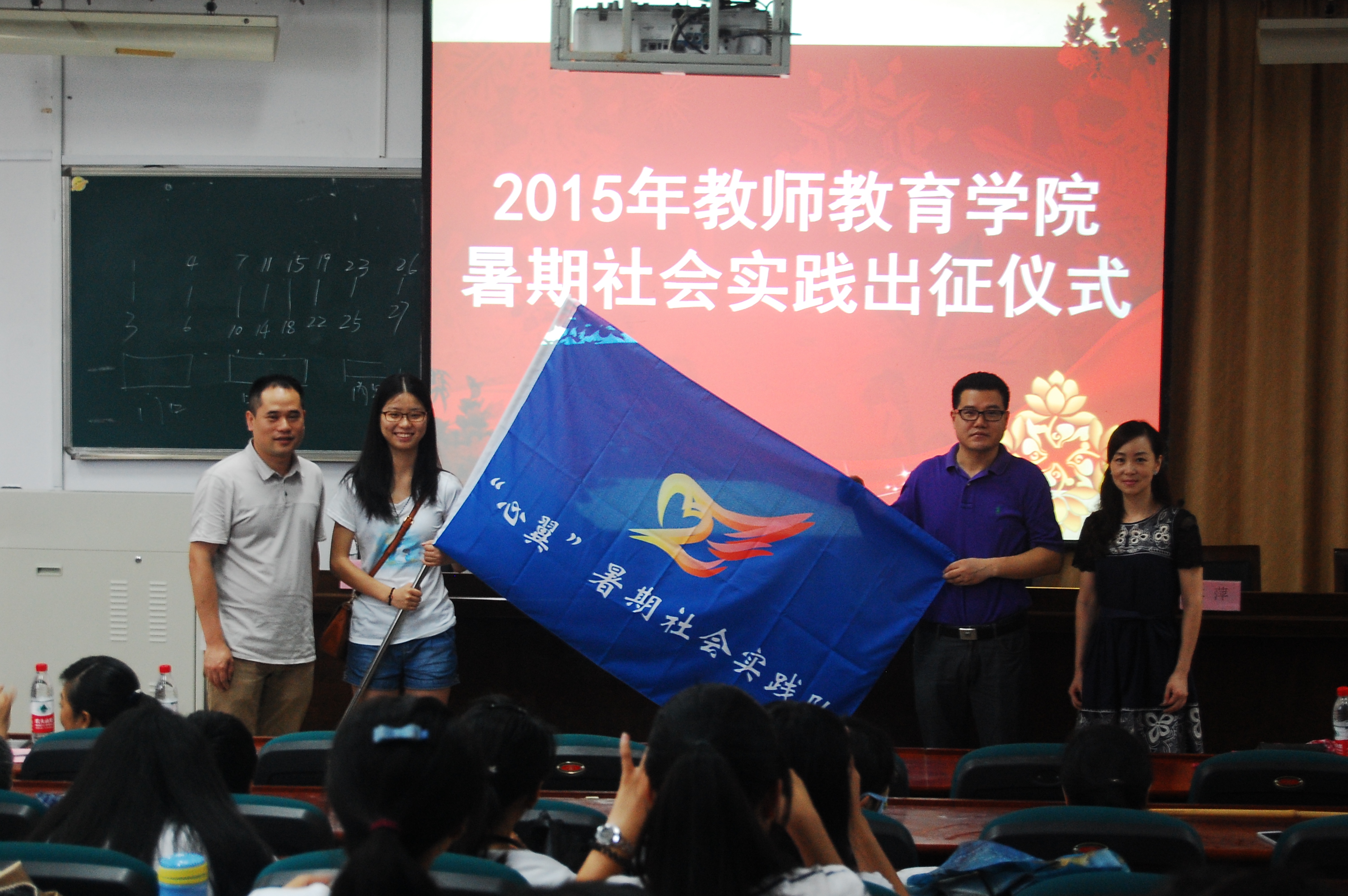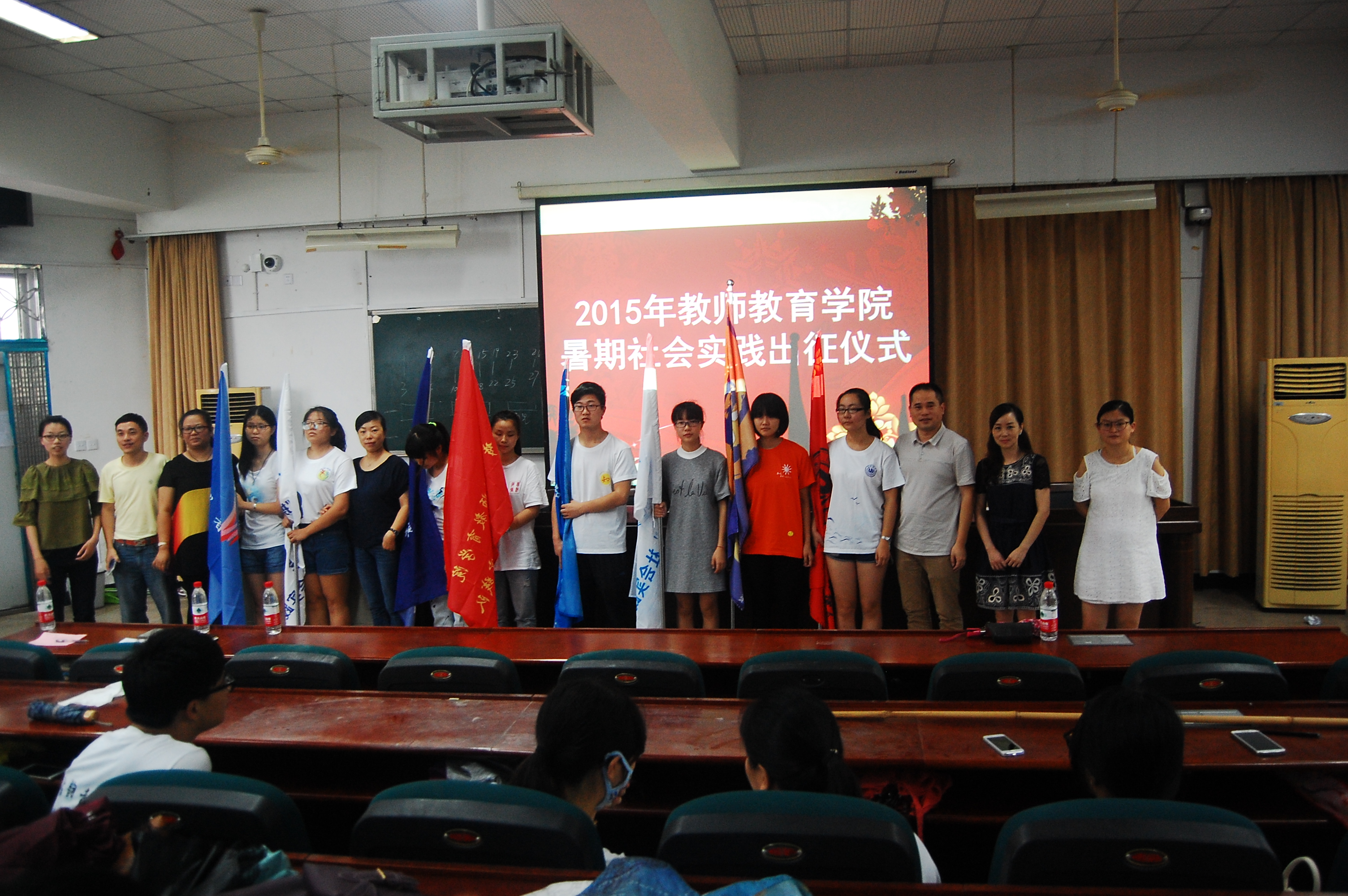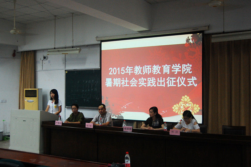 于7月10日下午在北3-101举行2015年暑期实践出征仪式,学院党总支书记杨立淮、党总支副书记杨丽君、学生科辅导员严晓秋,各实践队指导师胡瑜、陈旭微、刘海霞、胡铸鑫等老师,以及各实践队员近150人参加。会议由学生科副科长林萍主持。