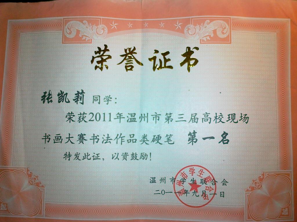 日前,温州市第三届高校现场书画大赛结果揭晓,泥巴影院 张凯莉荣获硬笔书法类第一名,黄妮芳荣获第二名,胡舒丹、陈称心荣获第三名,陈圆圆、祝好好荣获优胜奖;周伶俐、朱艳然分别荣获软笔书法类第二、三名。