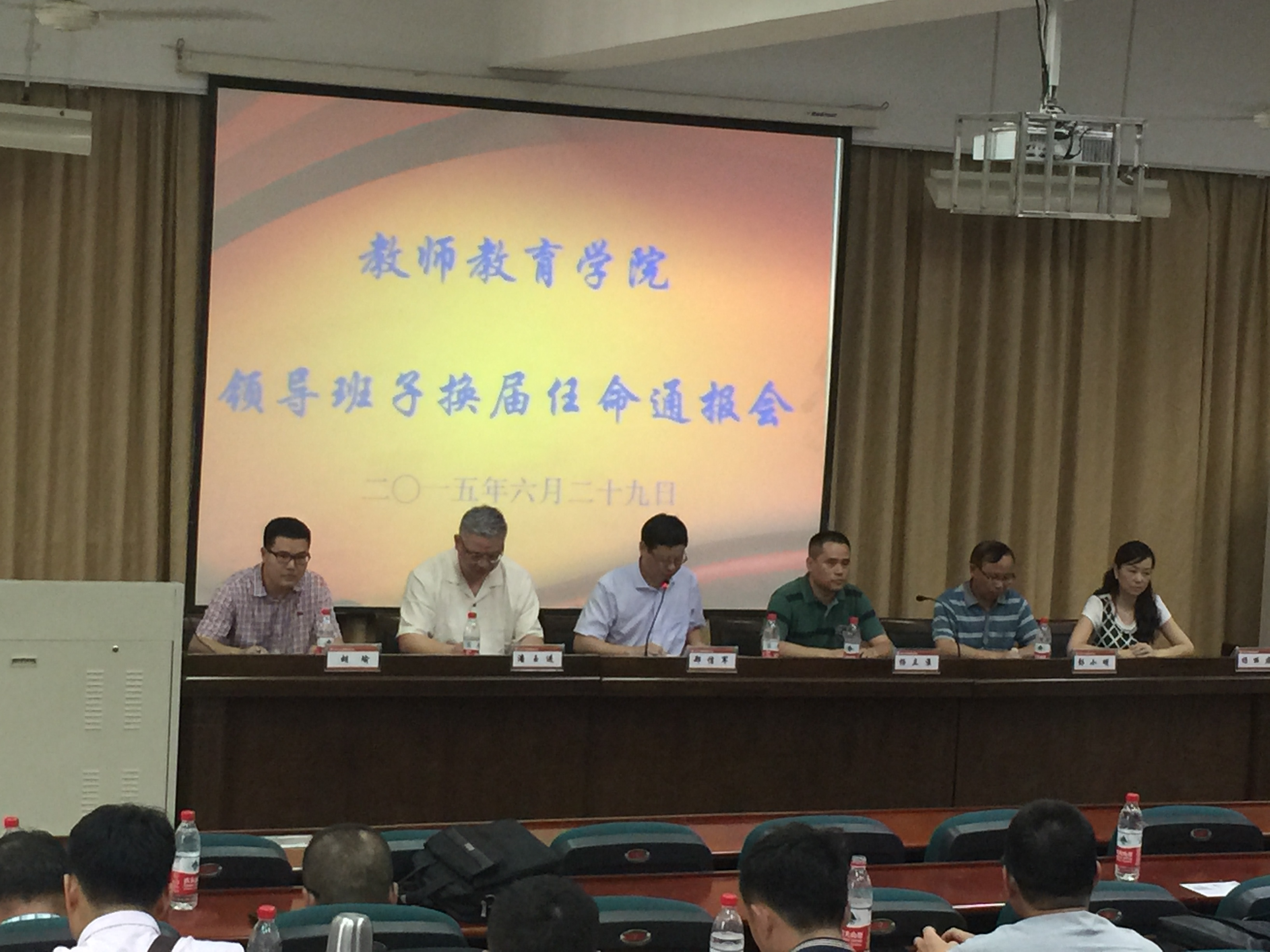 会议分两项议程。第一项议程是通报领导班子及科级干部的换届任命工作。郑信军院长向全院教师隆重介绍了新任泥巴影院 党总支书记杨立淮同志、党总支副书记杨丽君同志以及学生科副科长林萍同志,并宣读了学院领导班子新的分工。杨立淮书记、杨丽君副书记作了表态发言。