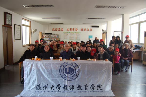 在军分区干休所里,志愿者们为所有老干部们献上了清明果和水果。随即,在军分区干休所的领导向大家致辞后,志愿者们为干休所老同志们及工作人员带去了精彩的表演,有《南泥湾》、《长江之歌》、《军营里飞来一只百灵鸟》等歌曲,还有即兴书法等。期间,干休所的老同志们及工作人员们看志愿者的表演看得兴致高涨,其中一位何叔叔给大家朗诵了他的诗作,还有位杨爷爷多次上台表演,不仅带来了葫芦丝演奏,还用长笛为志愿者带来的歌曲《映山红》伴奏,干休所工作人员的一句“老少搭配,唱歌不累”更使得全场大笑。最后,表演节目在由杨爷爷领唱,全场齐唱的《没有共产党就没有新中国》的歌声中落下帷幕。
