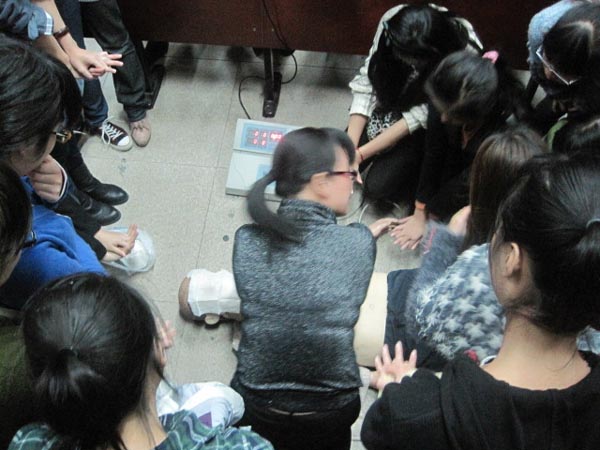 讲座上,陈玉熹医师针对现场的心肺复苏术、常见的意外急救等相关方面进行了详细讲述,还通过一些实际案例说明了现场急救的重要性,强调具备基本的急救知识(尤其是幼儿、小学教师)可很大程度地避免校园意外事故。在讲授急救具体操作时,陈医师利用各个具体的数据、操作参考图片等进行形象生动地讲述,使同学们更易理解。讲座现场,陈医师取出了带来的“模拟人”,运用先进的仪器让同学们进行现场演练,切实体会现场急救措施,提供了难得的学习机会。