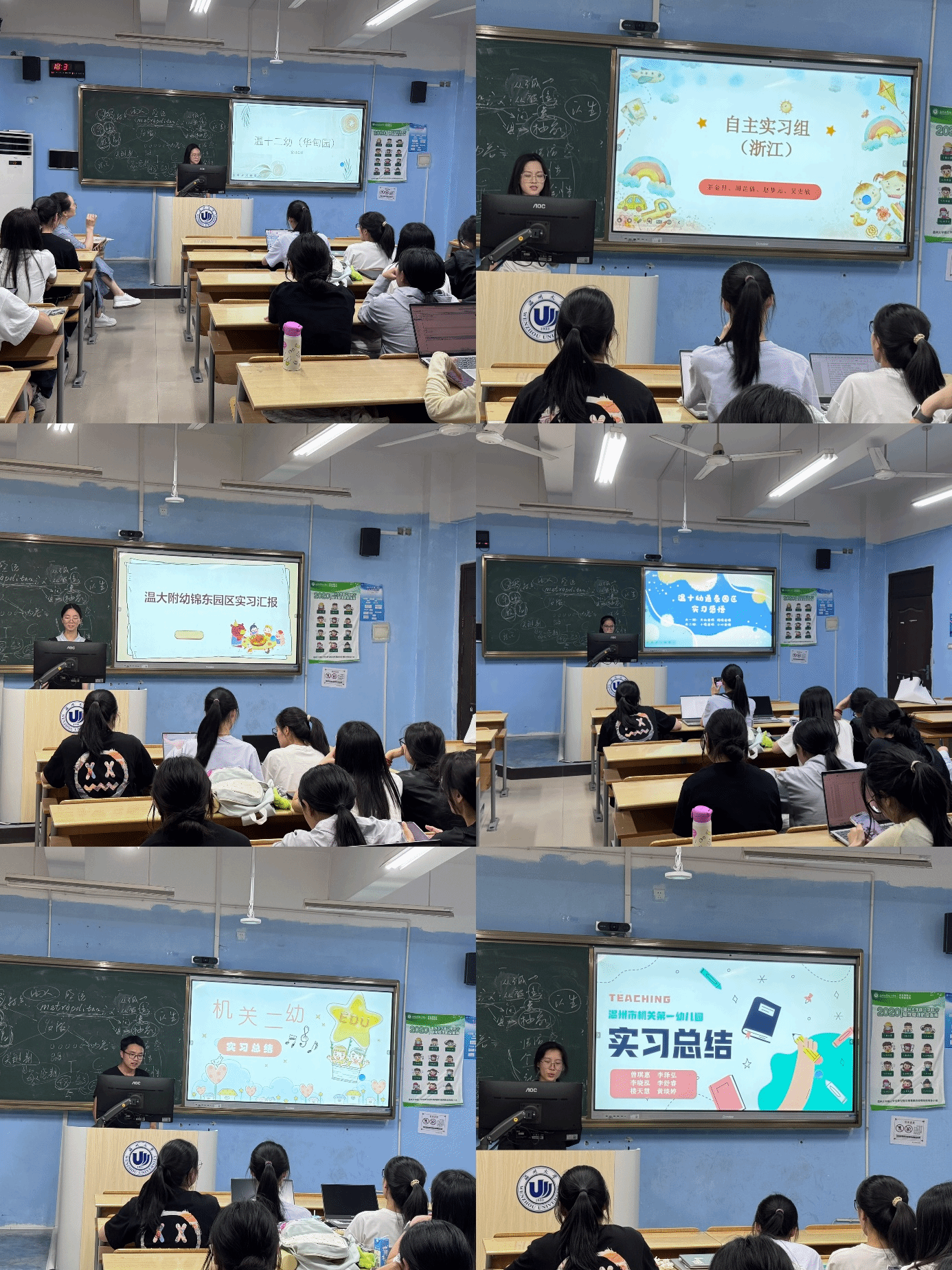 2025618日,班主任老师带领22学前本于瓯4-207举办实习总结大会。各实习大组代表依次登台,分享着他们在实习期间的点点滴滴。从初次踏入幼儿园的青涩与紧张,到与孩子们建立起深厚情感后的从容与幸福;从精心策划教学活动的反复打磨,到应对各种突发状况的沉着冷静,每一个故事都饱含着成长的喜悦与感悟。代表们声情并茂的讲述,搭配着现场展示的实习照片和视频,生动地再现了那段充实而难忘的实习岁月,让在场的同学们仿佛又回到了那段充满挑战与欢乐的日子,台下不时爆发出热烈的掌声。