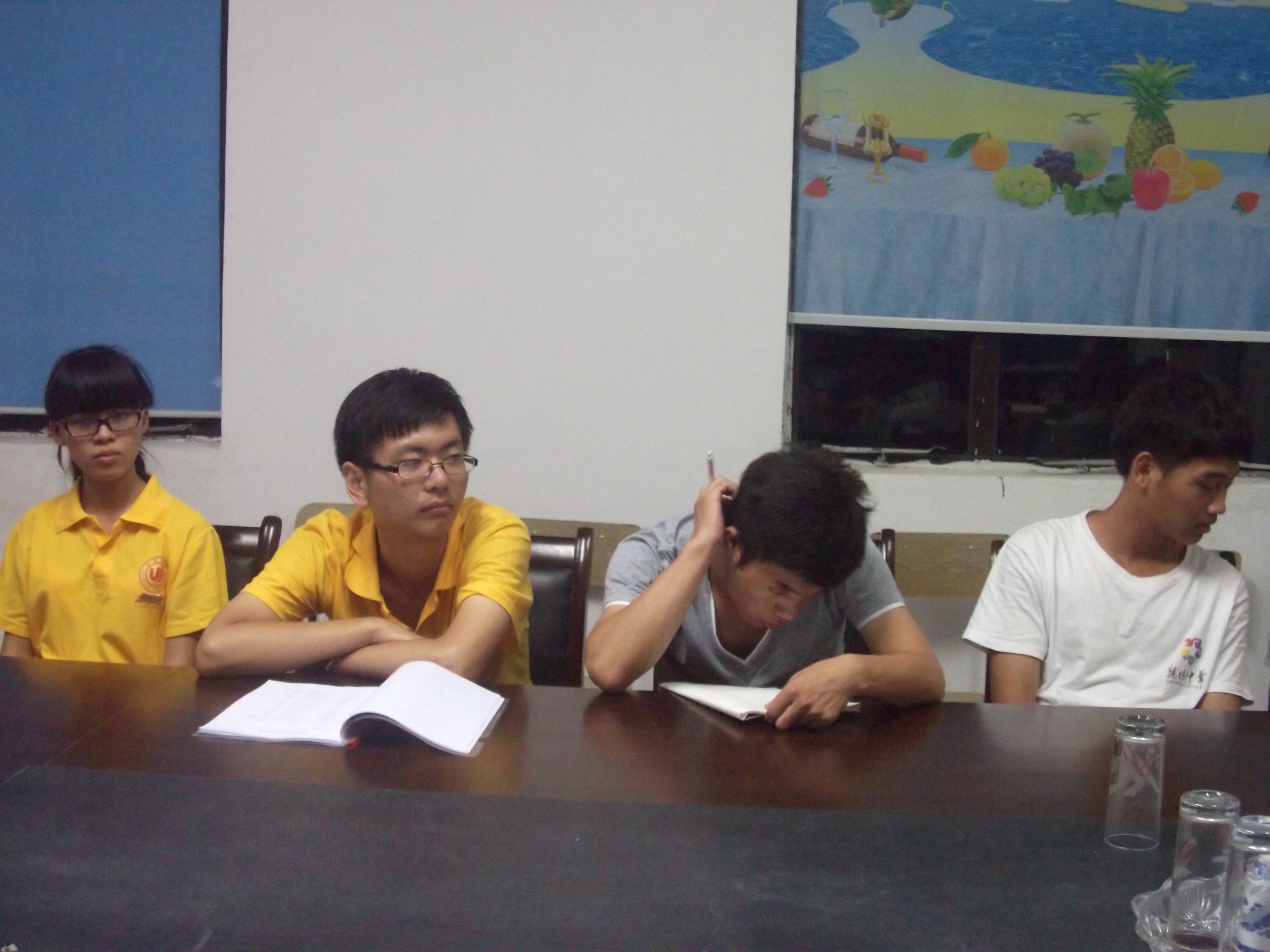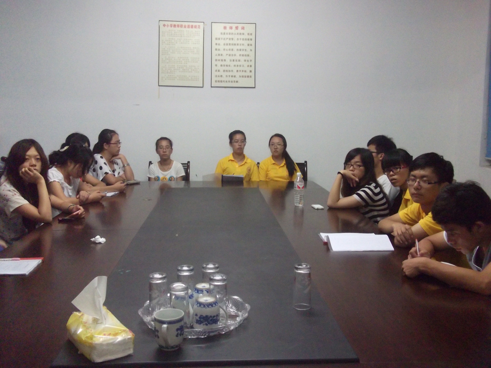 会议伊始,队长周瑞先向大家征询了暑期社会实践报告和思想政治报告的填写情况,提醒大家尽快完成报告的填写。随后,她还向各位队员说明了温州市侨界留守儿童快乐营毕营仪式的相关注意事项,并希望各位队员在接下来不足一个星期的时间里打起十二分的精神,积极投入到教学之中。接着,副队长曹静娴也向队员介绍了活动最后的汇报演出,从服装、后台、活动进展等方面一一讲解。会议最后,在队长周瑞的引导下,我们队员踊跃发言,详细地表述了两周以来自己在教学方面的经验。我们从教学感悟和思想工作等方面进行探讨,太极拳老师首先讲述了自己在教学方面的感悟,她认为良好的教学既要教会学生一定的技能又要教会学生如何学习,并重视游戏在教学中的重要作用;书法老师也认为,对学生进行思想教育时要注重学生的心理状态,我们要努力做一位严师,也要争取做一位良师;绘画老师则认为,教师要在学生面前树立一个优秀的榜样,潜移默化地教导学生。