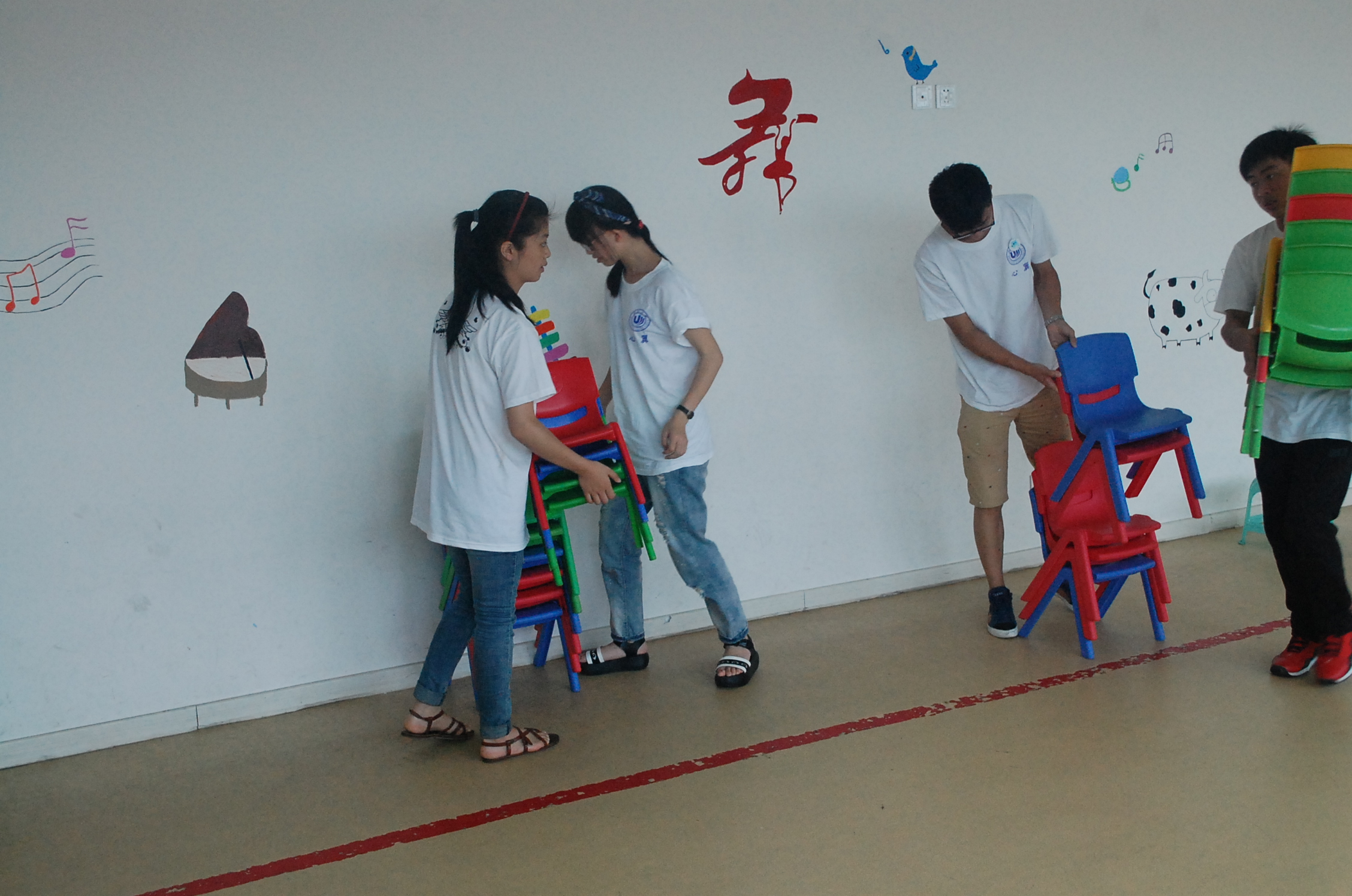 2014年7月3日,今天是心翼实践队在幸福驿站实践的第二天。有了昨天的经验,队员们对实践内容不再陌生。一到实践地,队员们就主动陪伴在孩子的身边,与孩子们一起玩耍,一起利用统感室的器械做康复训练。无论是上午的队员还是下午的队员,他们都紧紧跟在孩子们的身后,担心他们因平衡性不高而摔倒,引导他们将注意力集中在老师和眼前的训练道具上。虽然小朋友们今天学习的内容与昨天一样,但是队员们仍然耐心地陪在孩子们的身边,专注于他们的一次次重复,与家长共同期待他们的一点点进步。