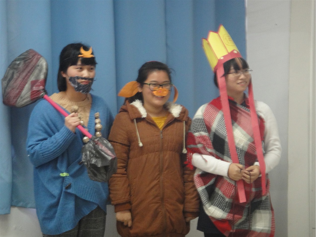 比赛伊始,同学们先给我们上了几盘开胃小菜,讲故事的氛围渐浓,而后一幕耳熟能详的《灰姑娘》掀起了比赛的高潮。选手们以诙谐幽默的表演方式,重新诠释了这个童话故事。《木偶奇遇记》将我们带入了神奇的想象世界,同学们精心制作的道具展现了各具特色的角色形象:雄赳赳的熊警官、纯真的小木偶、慈眉善目的老奶奶、天真可爱的小兔子、狡猾多计的狐狸,为观众呈现了活脱脱的一部微型舞台剧,结构完整,组织有序。《孙悟空三打白骨精》的桥段更是让人津津乐道,叶蕾、祝好好等同学带领她们的表演班子,再次冲击了观众的视听觉。叶蕾扮演的孙悟空从道具到服饰、包装已有八分形似,再加上对孙悟空语言、神态、动作等细节的模仿,让人恍觉悟空再世,不禁从心里飘出一句“大师兄”。祝好好将白骨精的妖娆风姿表现得淋漓尽致,入情入戏的表演令人叹服。