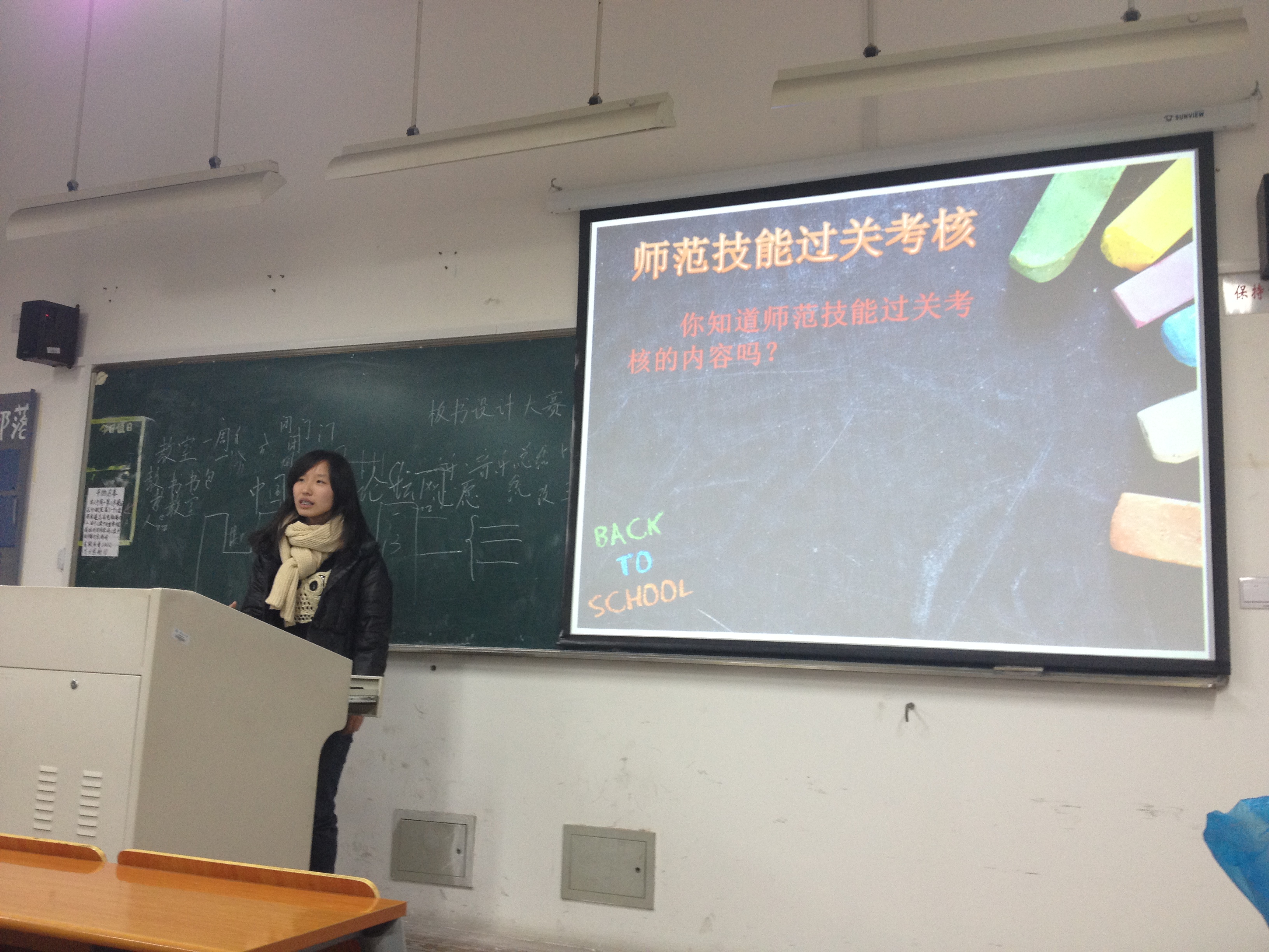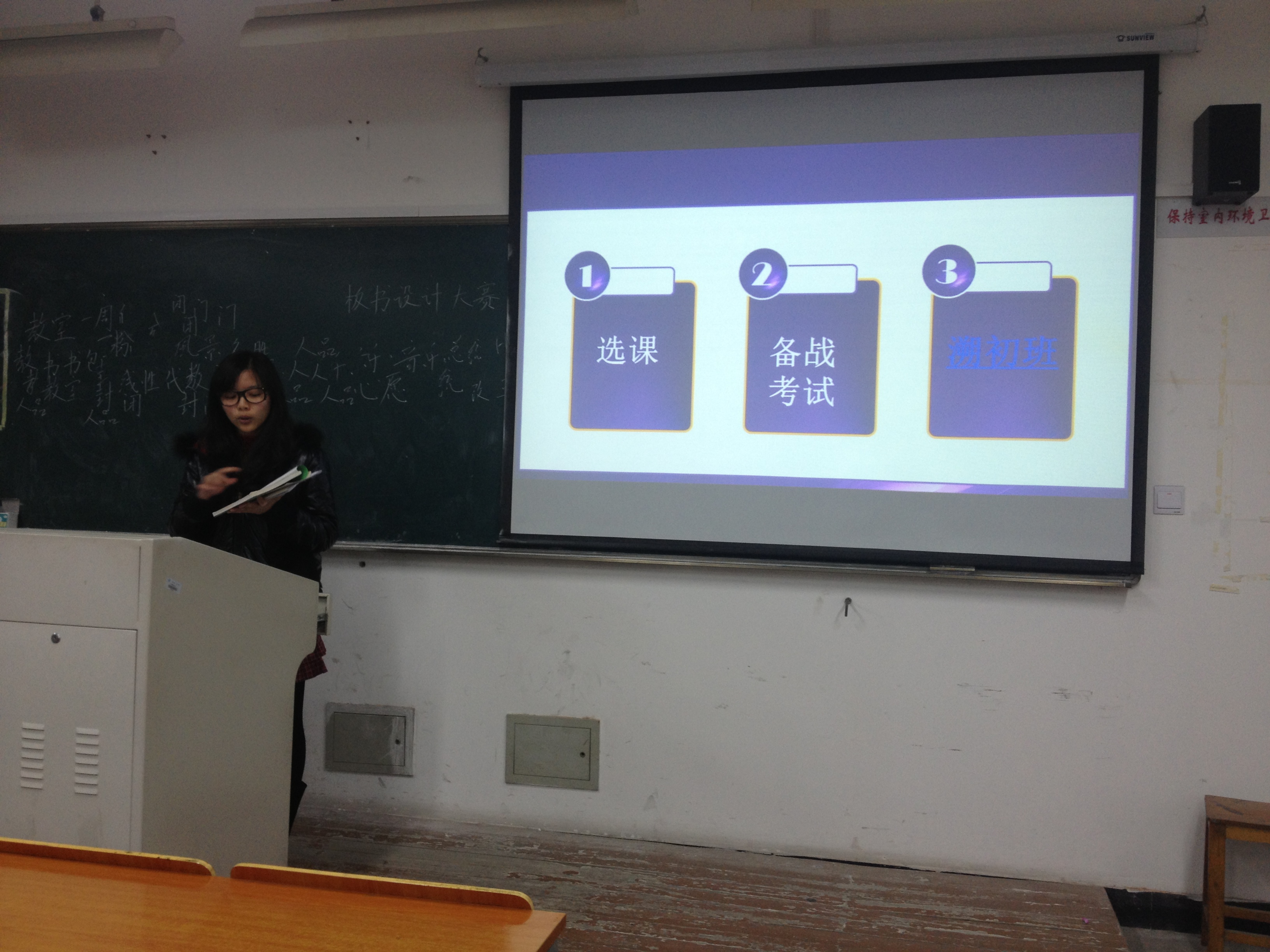 第二位与我们分享的是在不久前的省师范技能大赛中荣获一等奖的王怡璇学姐。她主要与我们分享了有关师范技能考核的相关事宜,尤其是关于教学设计、课件制作、说课、模拟上课、板书等面的内容。当被问及她是如何获得省师范技能大赛一等奖这一师范生梦寐以求的荣誉时,她自嘲地说是凭借她的厚脸皮。当她被“溯初班”拒绝的时候,她“厚脸皮”地与院队的同学们一起参加暑期集训;当她制作的课件被总指导师批评地一无是处时,她“厚脸皮”地回去重做,然后拿着新课件去找老师……于此,笔者认为,再大的困难都是抵不过用心二字的!