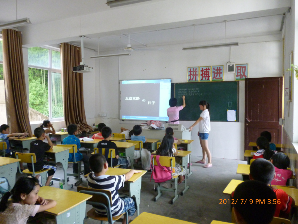 《北京东路的日子》的旋律一响起,孩子们就大声的跟着唱起来,那节奏抓的,一个个都是小音乐家。有模有样的。他们唱得真的很好,这首有点难度的歌曲,在他们那里也不在话下。老师都没怎么教,他们基本上都能唱下来了。而且声音响亮,他们的歌声响彻了整个学校,一直蔓延到这个小小的村落。在彻底掌握了这首歌之后,教室里突然响起了《最炫民族风》那劲爆的旋律。教室里的气氛猛地一变,老师让大家都站起来,跟着节奏随意的扭转身体。大家呼啦啦的站起来,女生扯着自己的裙子来回的旋转。男生转转头,伸伸手,间或的做做鬼脸。老师们也和他们一起疯,大家一起唱着这首神曲。一首歌下来,教师和学生之间的距离又拉近了不少。这两首很具有反差的歌曲,都给孩子们带来了莫大的乐趣。孩子们都扯着嗓子在那唱,好像唯恐老师听不见他的歌声。他们激动地泛红地脸庞上滚下了一粒粒豆大的汗珠,不过,谁也没空去理会。在最后几分钟的时候,队长忽然说要请后面的老师为大家高歌一曲,教室里顿时炸开了锅,小孩子们一个个的拍着桌子叫好啊,有些性子急的已经上去推着老师上台了。陈巧军老师只是很淡定的挑了挑眉毛,二话不说走上讲台,为大家清唱了一首《我的歌声里》,唱的好啊,连原唱都比不上。小孩子们拼了命似的鼓掌啊。欢呼啊。弄得老师都不好意思了。另一位郑贤文老师唱的是《父亲》,很有沧桑感,小孩子们在他唱的时候都安静地听,在他唱完之后还喊着再来一首。
