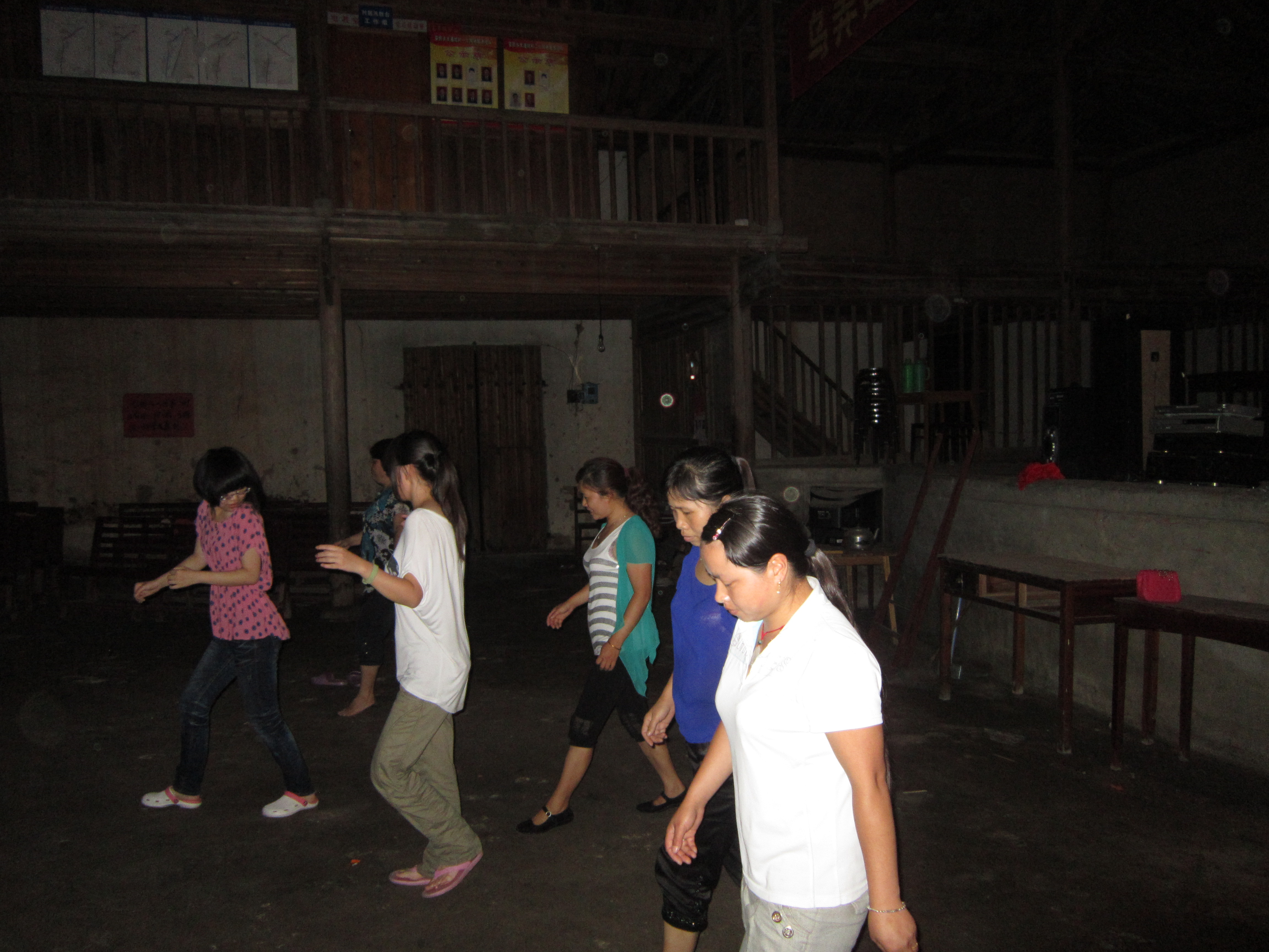 陈老师对我们的到来表示欢迎,很热情的招待我们。她好像非常的害羞,总是躲着镜头。她说,如果我们有任何的困难,都可以去找她,也可以使用办公室的设备。让我们很不好意思。这次讨论的主要问题就是关于最后的汇报演出的各项事宜。首先,就是节目单的制定。我们表示,我们会出包括合唱,舞蹈等的节目。因为我们的汇报演出是与乡里的一个农民文化节联系在一起的,所以乡里也会出一些节目,包括广场舞啊,独唱等。乡里也会提供场地,舞台的布置和音响也是乡里负责的。所以,安民乡真的是为我们提供了极大的便利。其次,就是演员们的衣服。因为乡里的衣服也不是很多,所以,更多的只能是我们自己解决了。最后,就是关于主持人的选定,节目的先后顺序等一些小问题的讨论。我们也都取得了共识。陈老师确实是一个十分和蔼的人。她对我们帮助良多。快要结束的时候,她带我们去他们排练的地方,去看广场舞。结果我们到那里的时候,却是大门紧闭,原来她们今天晚上休息了。陈老师为了让我们感受一下广场舞的魅力,一个电话把好几个阿姨叫了过来,跳给我们看。随着节奏感强烈的舞曲响起,阿姨们开始起舞了,我们都手足无措啊,阿姨们就带着我们一步步地跳,很耐心地教我们。虽然我们都不是很会,但是阿姨们的热情感染了我们,不管三七二十一先跳吧。阿姨们还夸我们学的很快呢!我们还约定明天还要来和阿姨学舞。