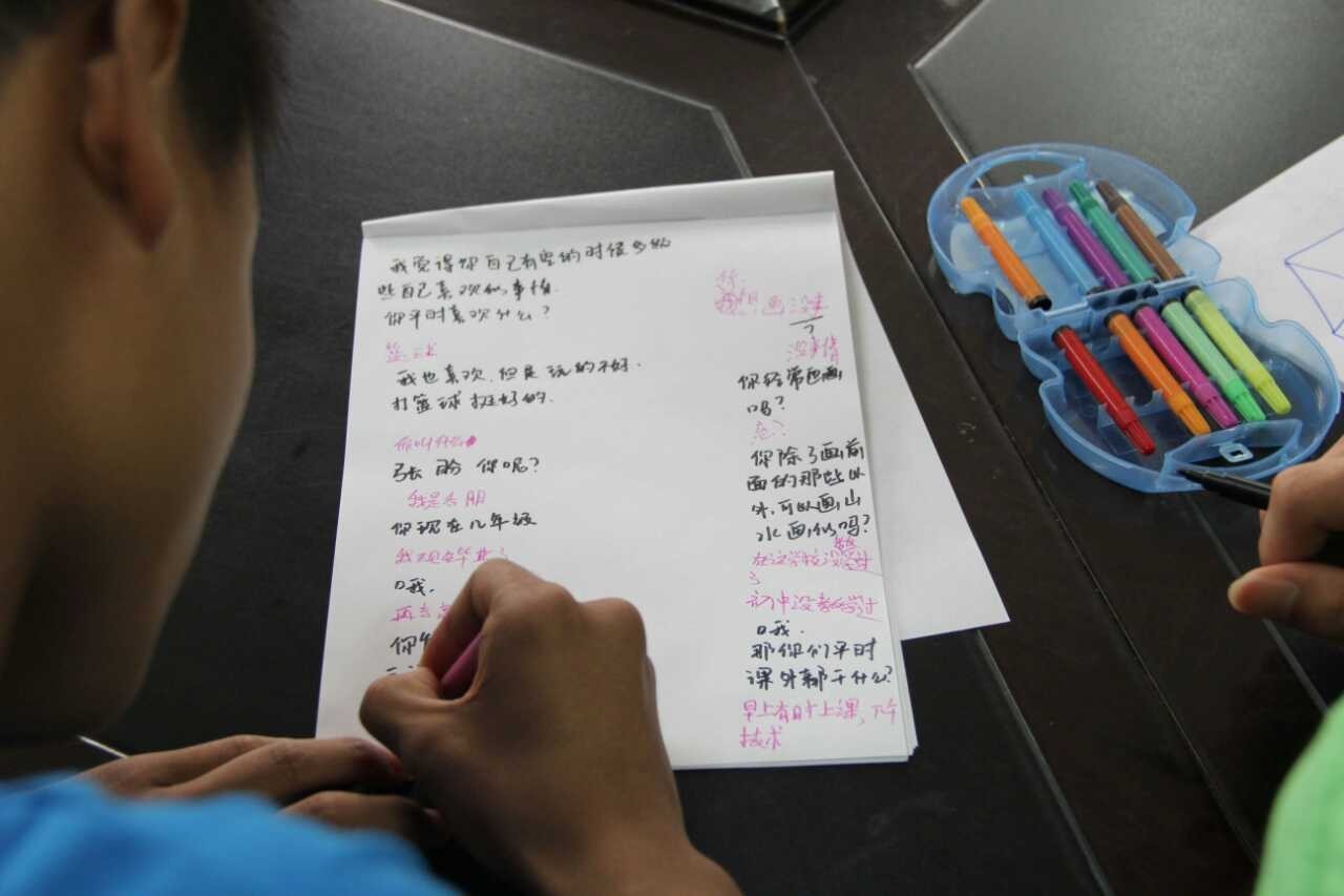 今天,安排的主要内容是画画。绚烂的色彩开出了繁盛的花朵,呈现着蓝蓝的天空,飘着洁白的云彩等等这些自然景物,更有成员教孩子们画可爱的叮当猫和调皮的蜡笔小新这些动漫人物。孩子们在画图中寻找到了乐趣,成员和孩子们玩的很开心,画图本上也记录下了彼此的交流对话。孩子们用彩笔画出了自己对于这个世界的定义,同时,队员们也在一旁认真地关注着,以便提供不时之需。有一个小女孩画了这样一幅画:画面上盛开着朵朵莲花,旁边点缀着莲蓬,这稚嫩的孩子赞美莲的纯洁,渴望成为莲花一般雅士。孩子们的绘画让队员们有着深深的感触,他们是“断翅”的孩子,但是拥有伟大的梦想。全体成员和孩子们待在一起的时间总是飞驰而过,一天的授课,不如说是相互学习的一天又过去了。