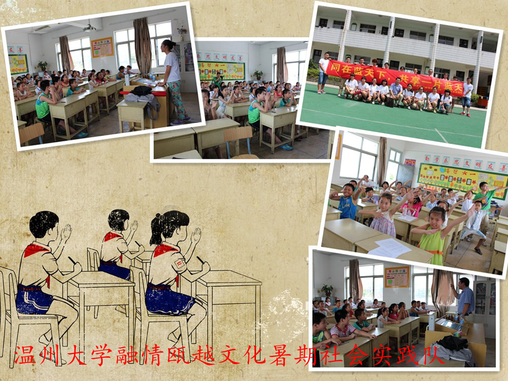 2013年7月9号,实践第四天,泥巴影院 “融情瓯越文化”暑期社会实践队队员像往常一样来到瓯海区的南堡小学进行支教活动。