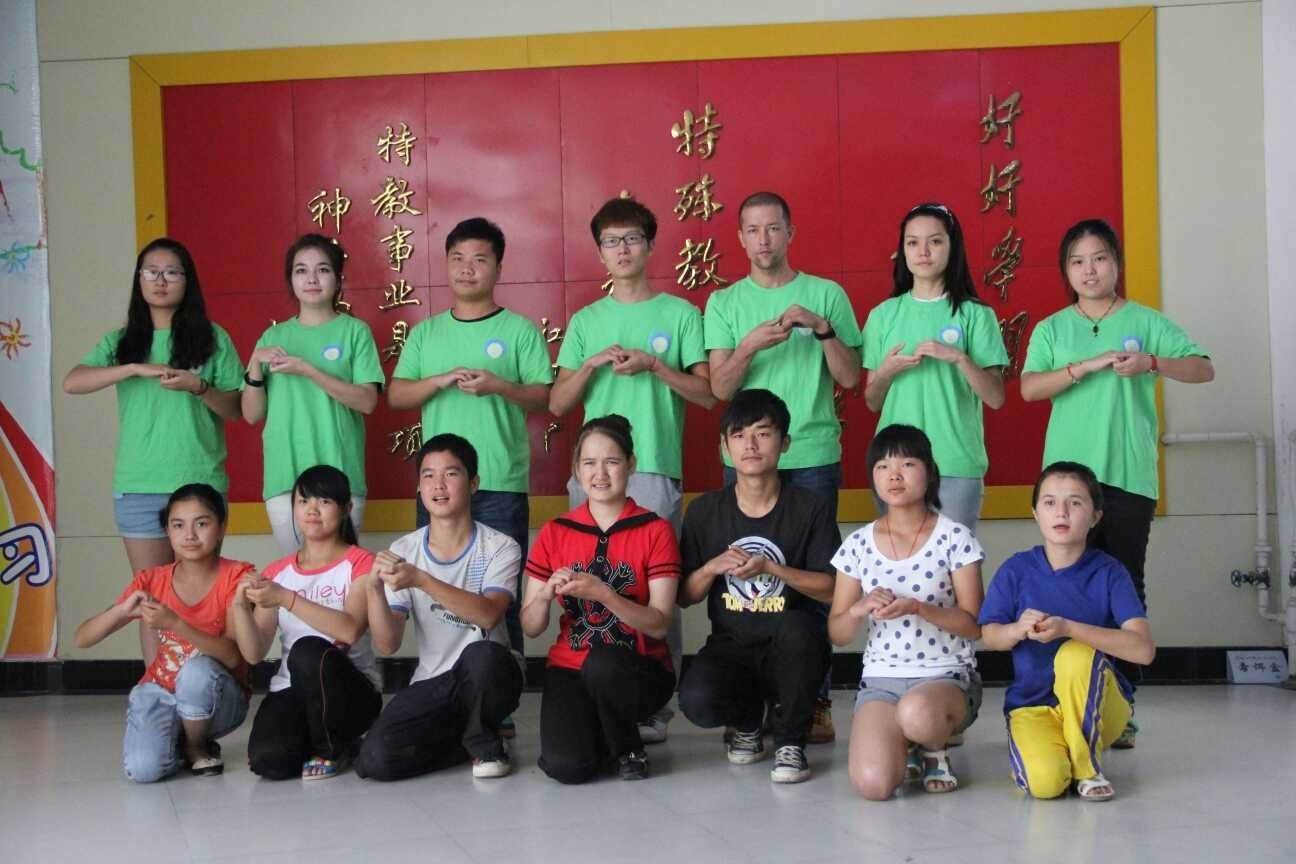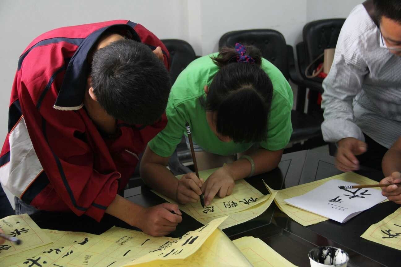 队员们穿着队服集合在校门口,笑容在他们嘴角绽放,孩子们早早就等候在教室里,聋哑孩子们一张张稚嫩而又青春洋溢的面孔打动着全体队员的内心。今天的主要内容是教孩子们写毛笔字,据聋哑学校的老师说,孩子们书写自己的名字都比较困难,所以全体成员一致决定教孩子们会写自己的名字。队员们彼此分工合作,洗笔、研墨、教授毛笔字……其中有成员在黑板上用毛笔字写了大大的“我爱新疆”四个字,代表着大家是团结的一家人,从不分离。孩子们积极的学习态度打动了在场的每一个人,他们也许先天存在缺陷,但是他们有一颗坚强的内心,支撑着他们快乐的一生。全体成员和孩子们开心的度过了一天的时间,跟孩子们呆在一起的时间总是过得飞快,这也许象征着一种青春的继续。
