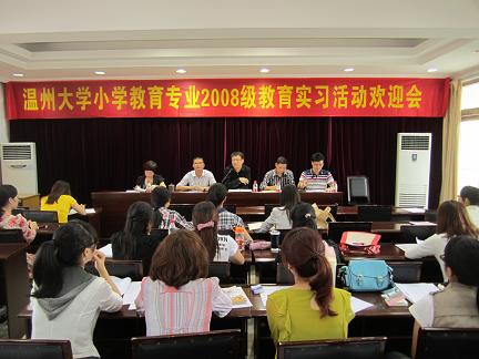 本学期参加实习的专业和人数迎来了新高,但是本次实习工作依然能在紧张而有序的进行着。在学院领导以及小教系领导和老师的关心与支持下,昨天08级小教本一、本二37名同学正式进瑞安市安阳实验小学和瑞安市锦湖实验小学实习,两所学校为我们小教系实习生的到来,特地召开了热烈的入点欢迎会。