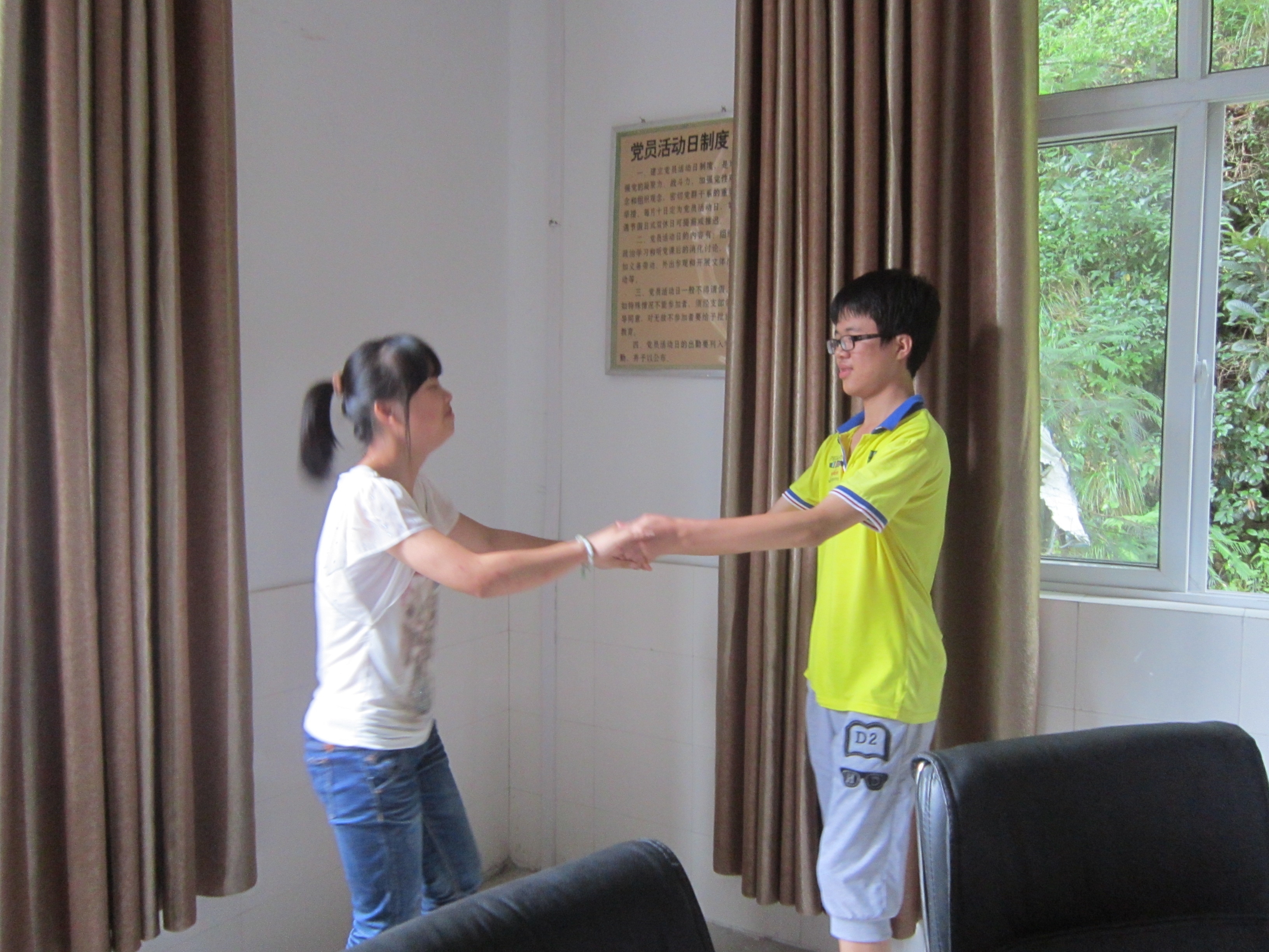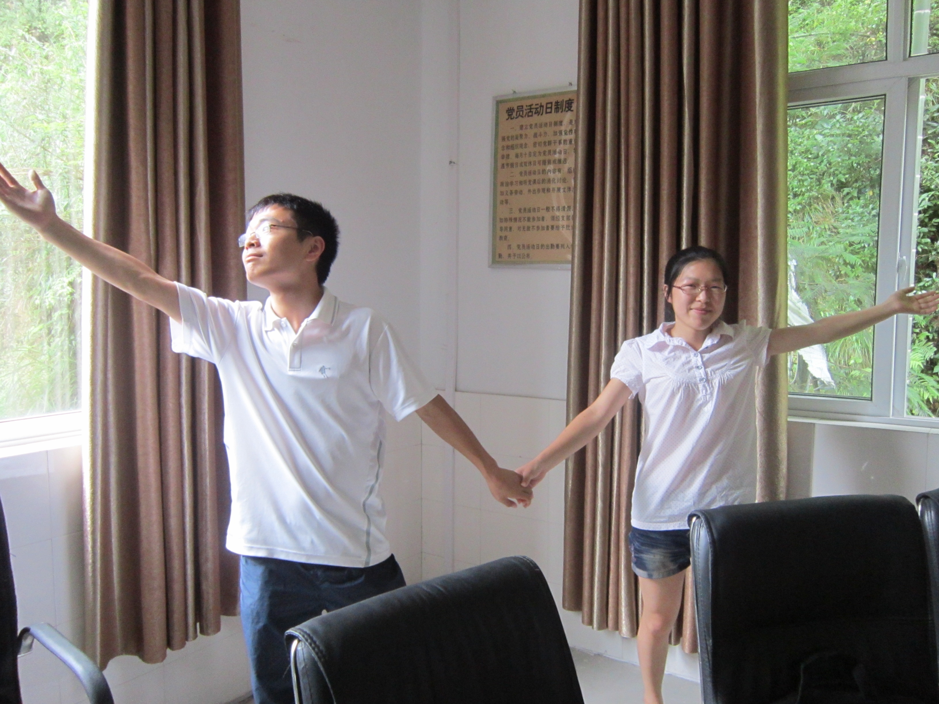 通讯组所要表演的是情景剧《英语四级前夕》,讲述的是五个人在考英语四级的前一天所表现出来的状态。这个剧本是一部十分纯粹的搞笑剧本。通讯组的组员们自己在对台词的时候都会忍不住笑出声来。因为还是在排练的初期,所以大家都还拿着台词。排练开始了,作为主角的梁冬冬一开口,同组的组员就全笑趴下了。那迷茫的表情和搞笑的口音实在是让人忍俊不禁啊。也难怪每每到梁冬冬的台词时就频频NG啊!可偏偏他自己还完全搞不清状况,用他那有点天然呆的脸对着我们,可想而知,全场又全趴下了。过了很久,大家才终于缓了过来,继续被打断的进程。这一次,大家都努力地忍住自己,好不容易才把整个剧本都过了一遍。可是剧本中间有一段需要表演,大家想了好多歌曲,从《老鼠爱大米》到《今天你要嫁给我》,考虑到搞笑的程度,大家最后一致决定就用《老鼠爱大米》了。有了歌之后,还要加上表演。可是在分工上又有了分歧,女生觉得女女搭配,男男搭配更有喜感。男同胞却极力反对啊!照他们的话来说,男男多别扭啊,他们绝对不允许这样的事情发生。最后,大家只好采取最原始的办法,用黑白猜来决定了。结果就是,男同胞们得意了。歌也准备好了,分工也确定了。那就是万事俱备,只欠东风了。我们商量好的动作是先执手相望彼此,再分开,最后再回来摆一个心的形状。说起来非常的简单,可是实施起来就是状况百出。不是女生看着男生的脸笑喷了,就是男生的动作不到位。总之就是一片混乱啊!革命尚未成功,同志仍需努力啊。好不容易大家正正经经的来了一遍,虽然还是有一点小小的瑕疵,不过第一次排练,这样的结果还是可喜的。最后,大家把台词和表演融合了一下。可以想象,这必定是可以让大家捧腹大笑的一部作品。