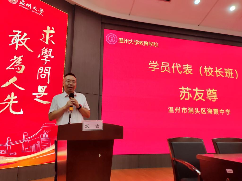 温州市洞头区海霞中学副校长苏友尊代表校长班学员发言。苏校长对本次培训给予了高度评价,并表达了学习就是一项“深度行为”:我们必须把培训的所学所获转化为一种实实在在的行动力,学校管理是一项事业,事业需要献身;学校管理是一门科学,科学需要探索;学校管理是一门艺术,艺术需要创造,我们要把学习的反思收获融进学校管理,才不愧对我们的教育事业。
