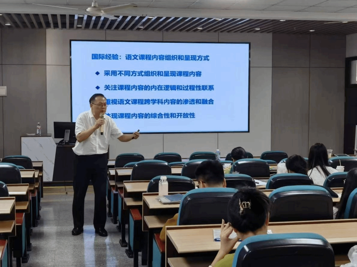 18日上午,李季教授首先作了题为《义务教育语文课程标准(2022年版)》基本理念讲座。从“采用不同方式组织和呈现课程内容”“关注课程内容的内在逻辑和过程性联系”“重视语文课程跨学科内容的渗透和融合”“体现课程内容的综合性和开放性”四个方面分享了他对新课标的理解。李老师指出当今语文教学存在的四个方面的问题,分别是学习内容碎片化、学习过程同质化、思维培养浅表化和学习评价单一化。在此基础上,他提出来义务教育语文课程价值的追问:学生应该成为怎样的人?学生应该知道什么?学生应该做什么?这些问题引发了学员们的深刻思考。李老师认为课程理念应当从目标、结构、内容、实施和评价五方面进行落实,并分别讲述了各方面应当达成的目标。最后李老师强调新课标的育人价值和核心素养以文化人的重要性,强调要凝练核心素养的关键表现特征、指向及其价值。