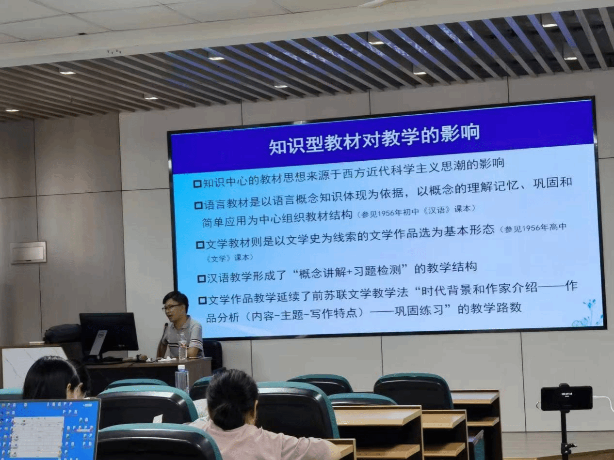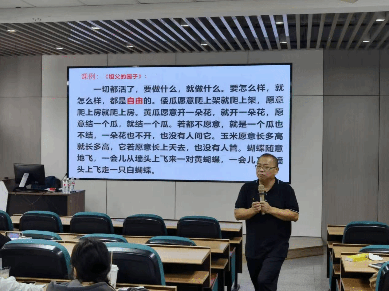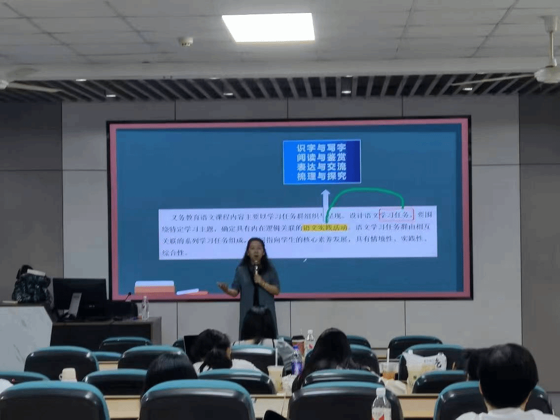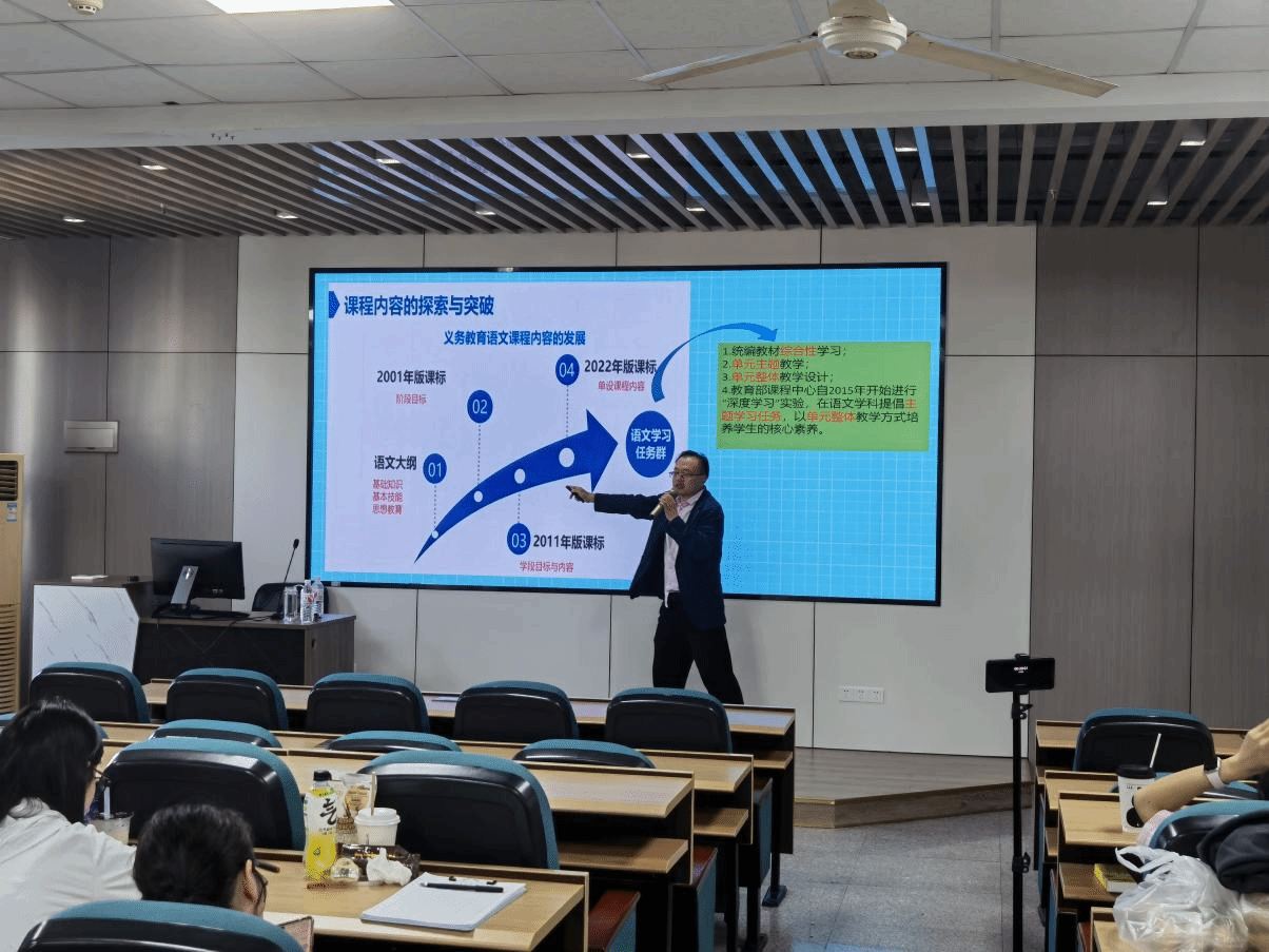 下午李季教师作了题为《基于语文要素、学习任务群、大单元的单篇课文教学设计案例展评》的讲座,李老师从单篇—单元—专题出发为学员讲解了教学设计要点,立足于课程标准解读课文教学设计的侧重点。他认为语文教学设计应结合语文课程内容体系的构建,理解核心素养与语文学习任务群之间的关系。讲座中,李老师以典型案例,广博的文本拓展,严谨又不失幽默的语言,引领学员沉浸式地进入单篇课文教学设计的世界,拓宽了学员单篇课文教学设计思路,提升了学员教育专业素养。