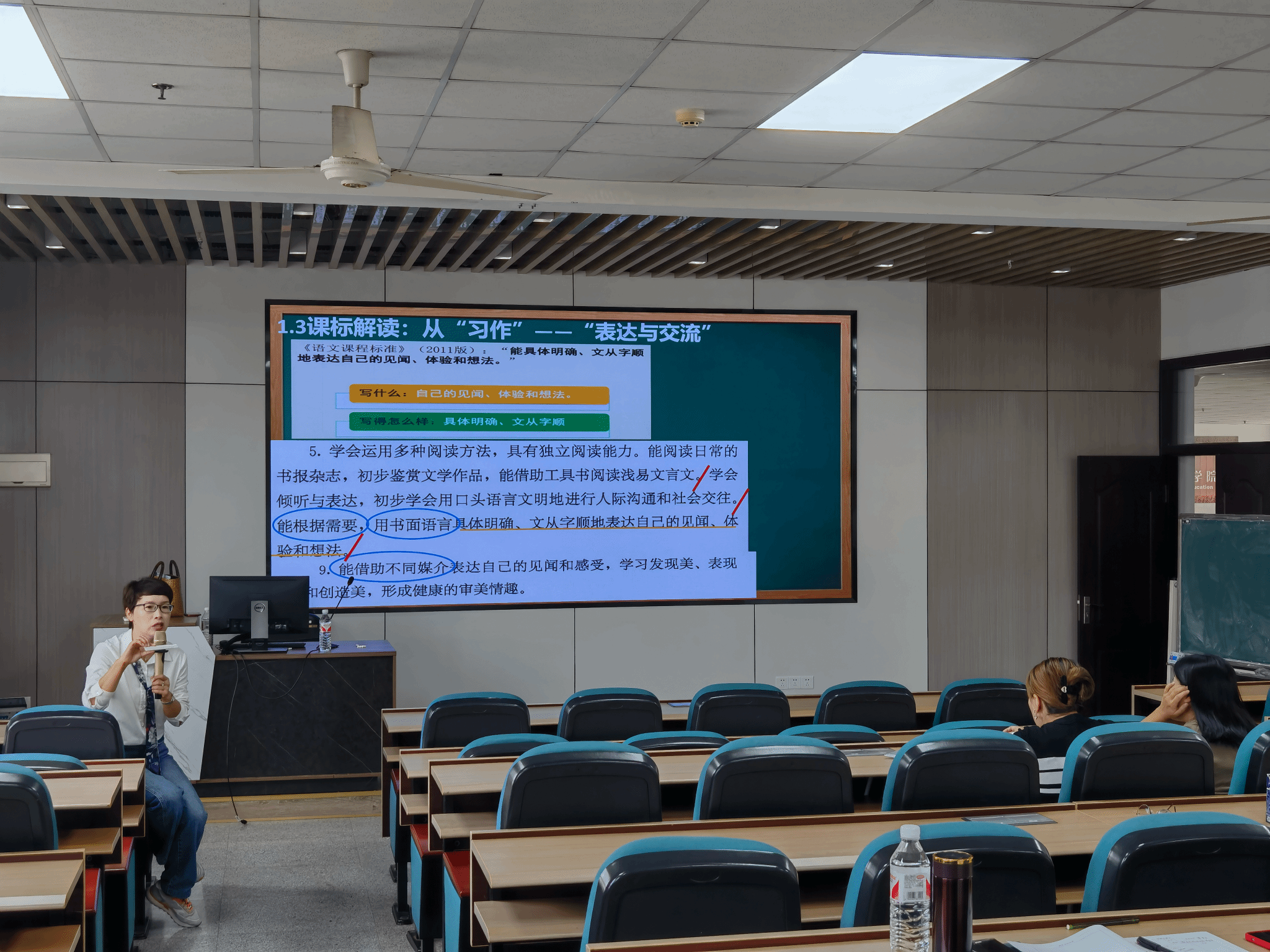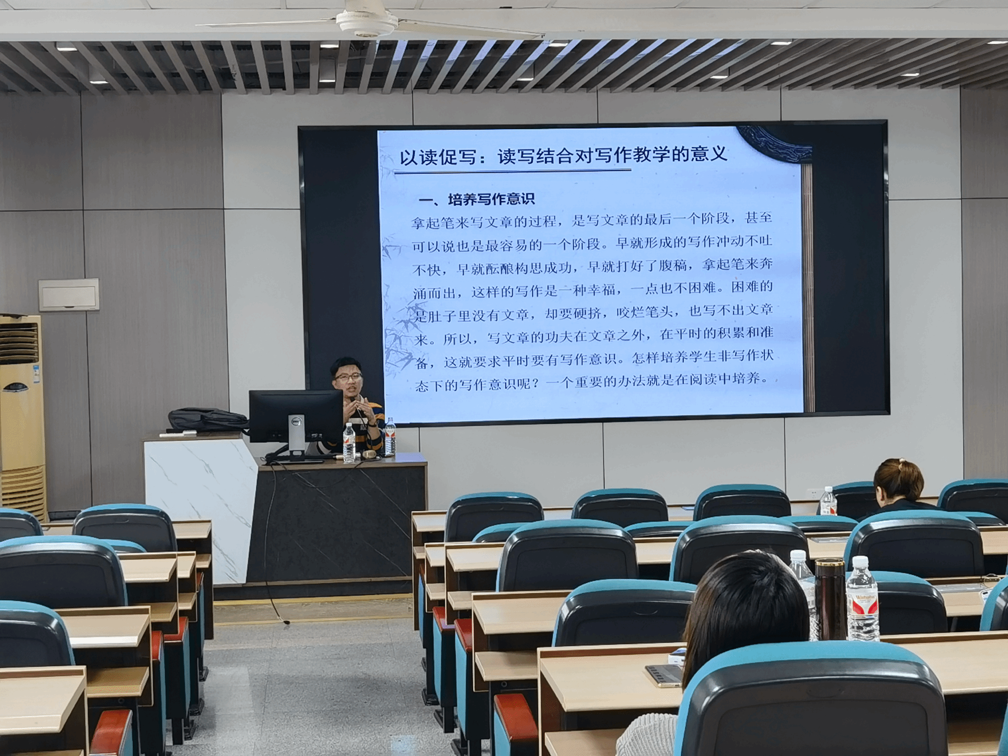 15日上午,李季老师阐释了“读写一体”的内涵及关系,梳理了教材中读与写的结合点的具体表现。提出阅读与写作是形成映射关系的,阅读应转化为写作的先行组织者。李教授指出,在读写结合教学中,阅读就是要从“读什么”的陈述性知识导向“怎么读”的形成性知识,从“写什么”走向“如何写”,创造读写发生迁移的条件。