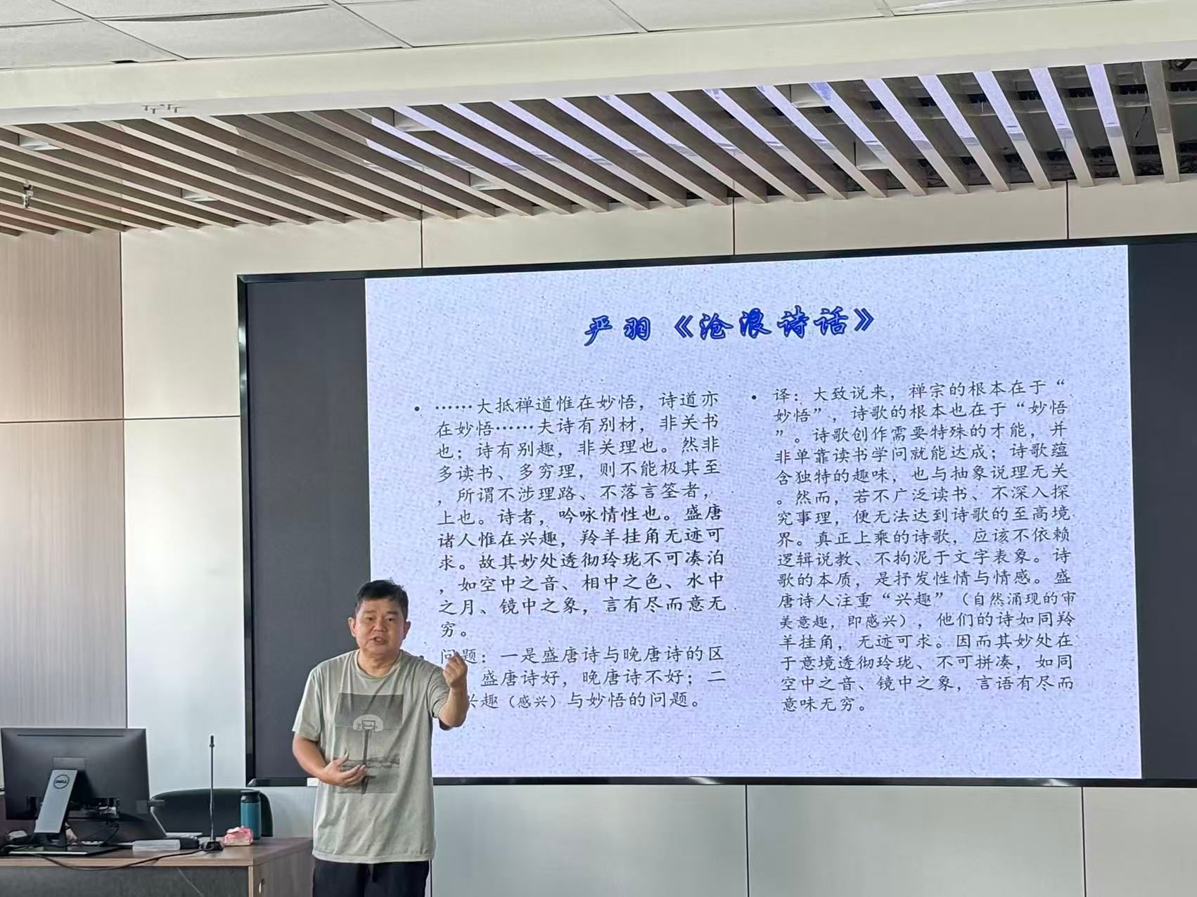 培训课堂打破“单向讲授”模式,以“沉浸式想象+个性化解读”点燃学员思维。在“诗词情境重构”环节,苏勇强老师引导学员结合杜甫《绝句四首》的创作背景——广德二年春归成都草堂的喜悦心境,解析“两个黄鹂鸣翠柳”中“个”字的创造性运用,以及“鸣”(明响)与“上”(暗响)的声律巧思;学员研讨李清照《如梦令》“绿肥红瘦”的通感表达,从“试问卷帘人”的对话细节中,还原词人雨后惜花的细腻心绪。