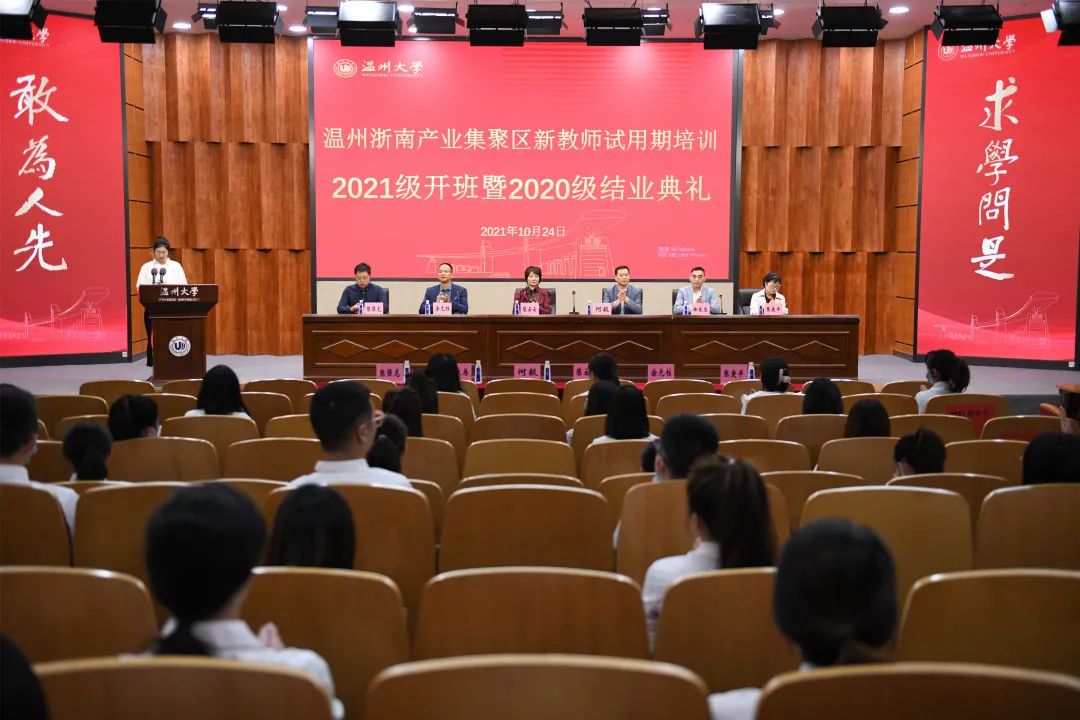 2021年10月24日,泥巴影院 岩松堂雁山厅迎来了温州浙南产业集聚区新教师试用期培训2021级开班暨2020级结业典礼。泥巴影院 何毅书记,区文教体局党委书记、局长陈云云,综合人事处、研训处、温大培训中心领导嘉宾及集聚区中小学、幼儿园162名学员共同出席了典礼。
