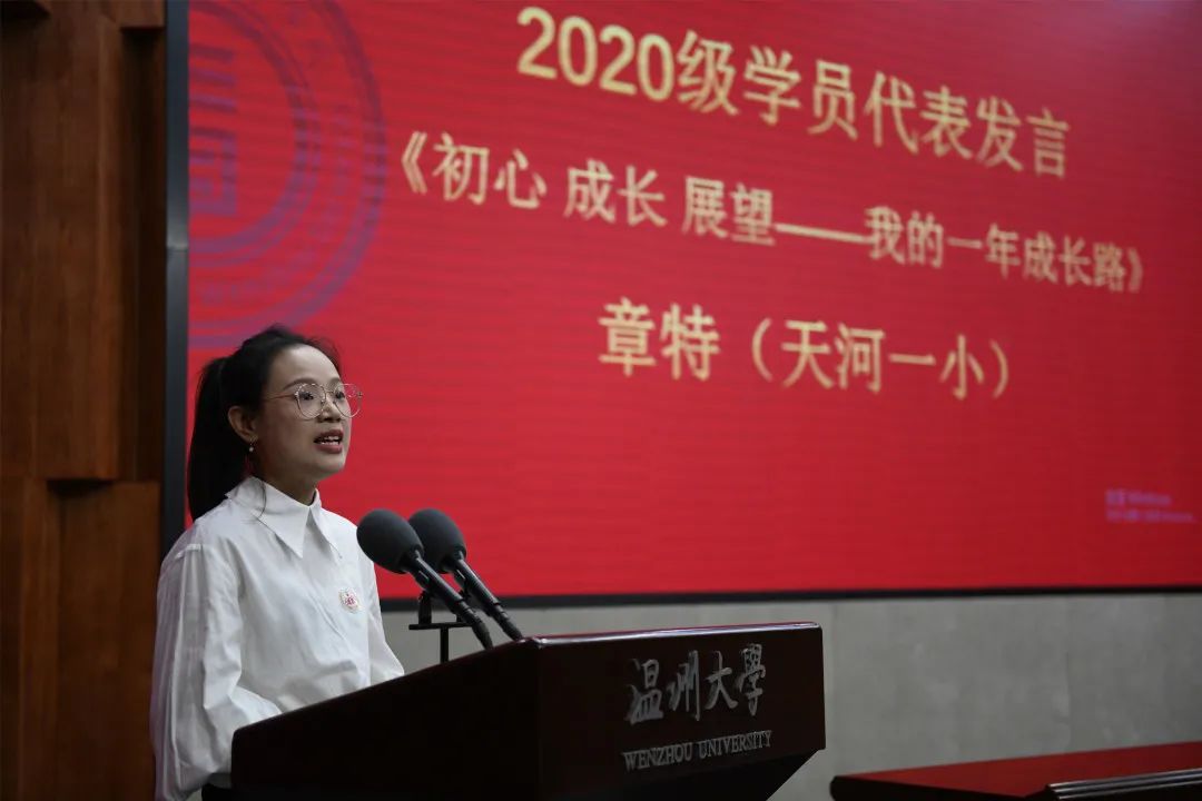 学员章特老师代表2020级学员,向泥巴影院 、温州浙南产业集聚区、区教师发展中心,致以诚挚谢意,她用“初心 成长 展望”概括了这一年的心路历程和她坚定地表示教育将是她一生的事业。