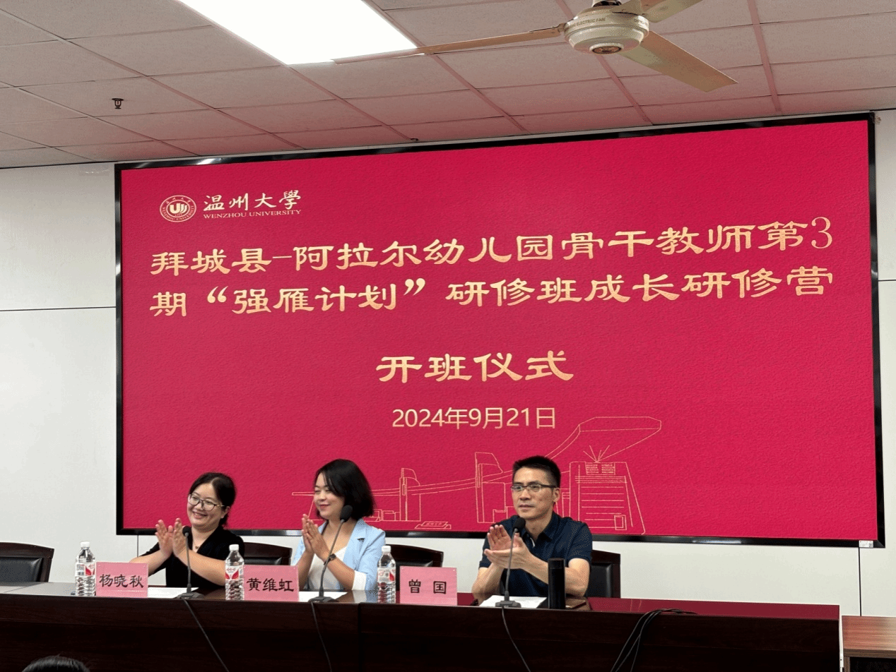 2024年9月21日上午,拜城县-阿拉尔幼儿园骨干教师第3期“强雁计划”研修班成长研修营开班仪式在泥巴影院 学院路校区继教楼502教室举行。拜城县教育局学前办黄维虹老师、泥巴影院 泥巴影院 曾国副教授以及来自拜城县和阿拉尔的骨干教师参加开班仪式。开班仪式由泥巴影院 培训中心副主任杨晓秋主持。