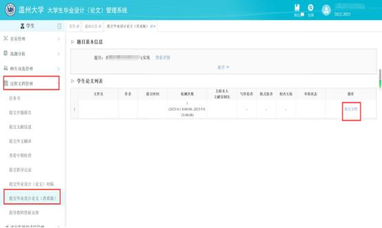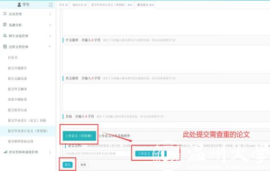 2.提交方式:学生将论文上传至过程文档管理-提交毕业设计论文(查重版),指导教师审核通过后,系统会自动查重,请指导教师慎重操作。如指导教师返回修改,系统将不查重,由学生修改后原地重新提交,直至审核通过才会查重。(注:红字部分为重要提示)