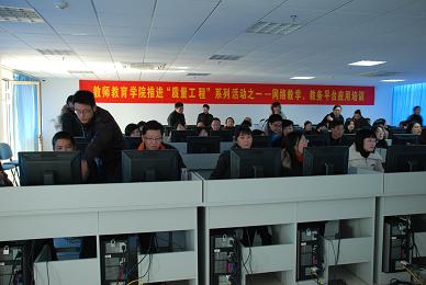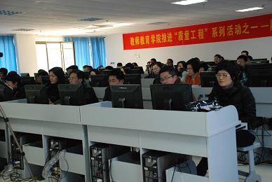 在教师教育实训中心424机房开展“推进质量工程”系列活动之一——网络教学、教务平台的应用培训。培训会邀请了教育技术学专业的刘根萍老师进行理论培训,学院全体教师与教学管理人员参加了此次培训。