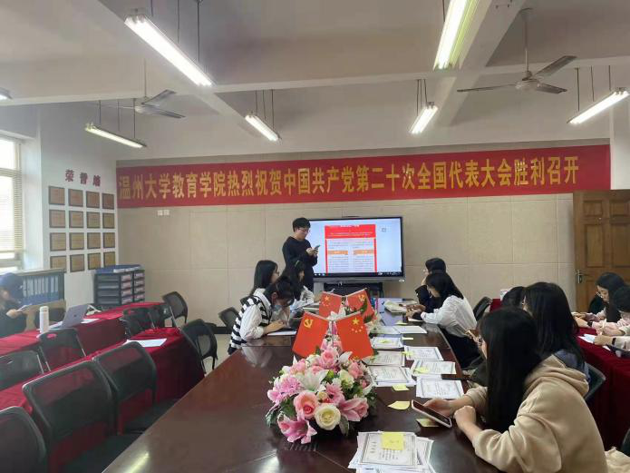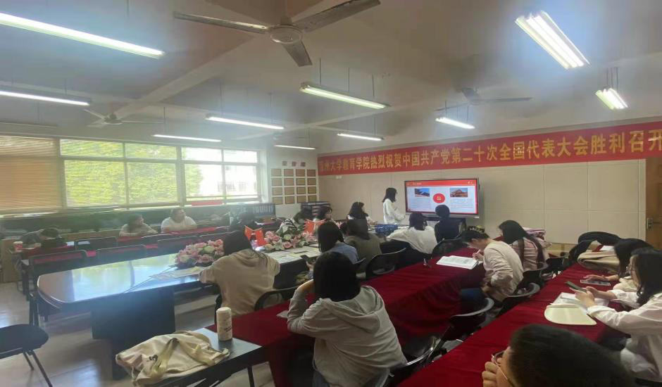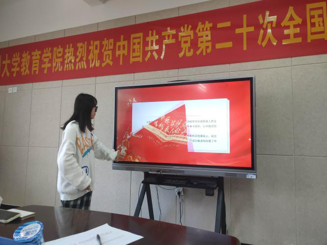 李若兰同志分享了《新时代新征程中国共产党的使命任务》,她倡导大家要牢记党员的使命任务,坚定信心、锐意进取,主动识变应变求变;傅彬煌同志分享了自己对于《中国共产党章程》修改对比的理解,并表示作为研究生党员,要扎实打牢理论基础,时刻跟随党的步伐;郑丹同志分享了实施科教兴国战略,强化现代化建设人才支撑的内涵,并从教育地位的日益上升的角度讨论人民教师如何为党和人民的教育事业做出贡献。