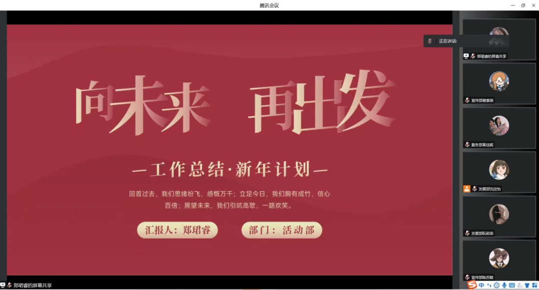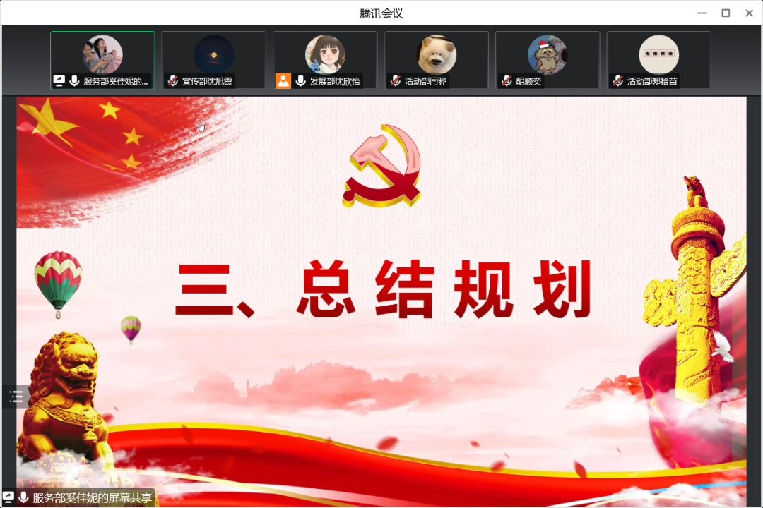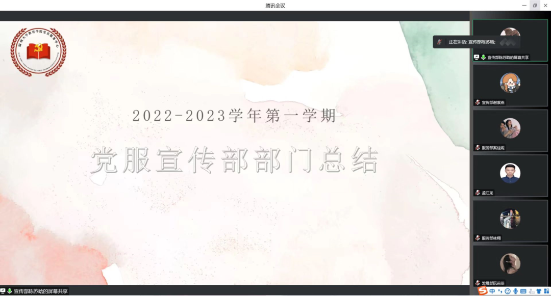 党服各部门代表总结本学期工作。服务部干事林翔从部门的主要工作内容和会议记录两个方面展开,回顾了党员下寝活动、义工招募、党费收缴等工作,并对下学期工作内容提出了设想。发展部干事阮莉菲总结了本学期党员发展与转正、党建档案整理、党员组织关系转接、党务系统维护等方面的工作,并反思不足,提出改进措施。宣传部干事陈苏晗从部门工作内容、任务分配、工作概述三个方面进行阐述,并表示在日后的工作中会进行更合理地分工,提高工作的效率。活动部干事郑珺睿从部门工作一览和部门成员反思两方面进行了总结,并表示在今后的工作中要加强部门内部交流,及时总结反思。