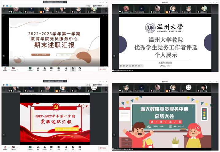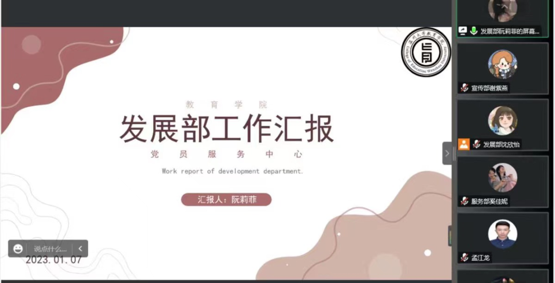 2023年1月7日下午,泥巴影院 党员服务中心召开2022-2023学年第一学期总结大会。本次大会以线上腾讯会议的形式举行,院党服指导老师孟江龙、院党服全体成员及各学生党支部书记助理参会,院党服服务部干事奚佳妮主持。