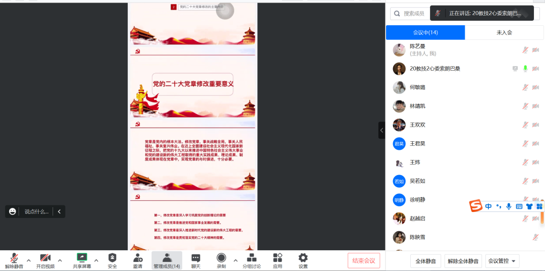 索朗巴桑同志进行关于《深刻领会二十大党章修正案的重大意义与重要内容》的学习分享。修改党章不仅是深入学习巩固党的创新理论的需要,还是推进党和国家事业发展的需要。他认为党员应当切实把党章各项规定要求落实到行动上、体现在工作中,切实维护好党章的严肃性和权威性,为全面建成社会主义现代化强国而团结奋斗。