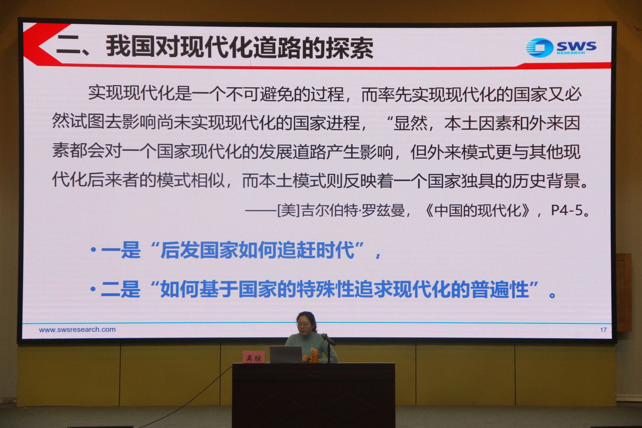 随后,吴琼老师以2050年实现社会主义现代化强国这一宏伟目标为导向,深入剖析西方现代化的本质特征,在历史的长河中回溯中国式现代化的艰辛探索历程,与同学们一起探讨西方现代化与中国式现代化的异同,明确中国式现代化的特殊性:是中国共产党领导的社会主义现代化,既有各国现代化的共同特征,更有基于自身国情的中国特色。