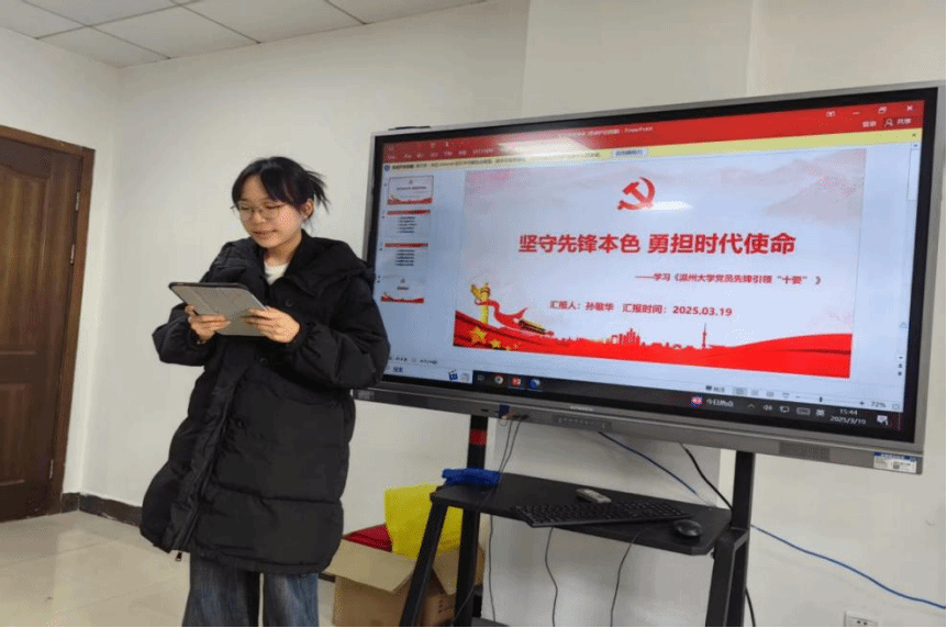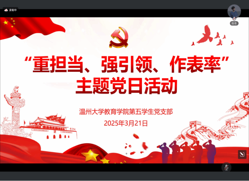 【泥巴影院 第六学生党支部】2025年3月19日,泥巴影院 第六学生党支部于瓯4-113A及腾讯会议召开“重担当、强引领、作表率”主题党日活动,支部书记方珊主持,董雅宁记录,应到12名正式及预备党员,实到12人。董雅宁同志围绕“重担当、强引领、作表率”及泥巴影院 党员先锋引领“十要”展开理论分享,介绍主要任务、工作安排、要求,并解读党员先锋引领“十要”,涵盖教师党员“五个自觉”与学生党员“五个带头”,激励党员发挥先锋作用。潘锦豪同志分享全省高校党的建设工作会议精神,阐述会议背景意义及“培根铸魂强基”工程要求,呼吁党员落实会议精神。最后,支部书记吴琪琪老师总结,强调共产党员不信教不参教,要坚守马克思主义信仰,践行宗教观,严守党章党纪,做合格党员。