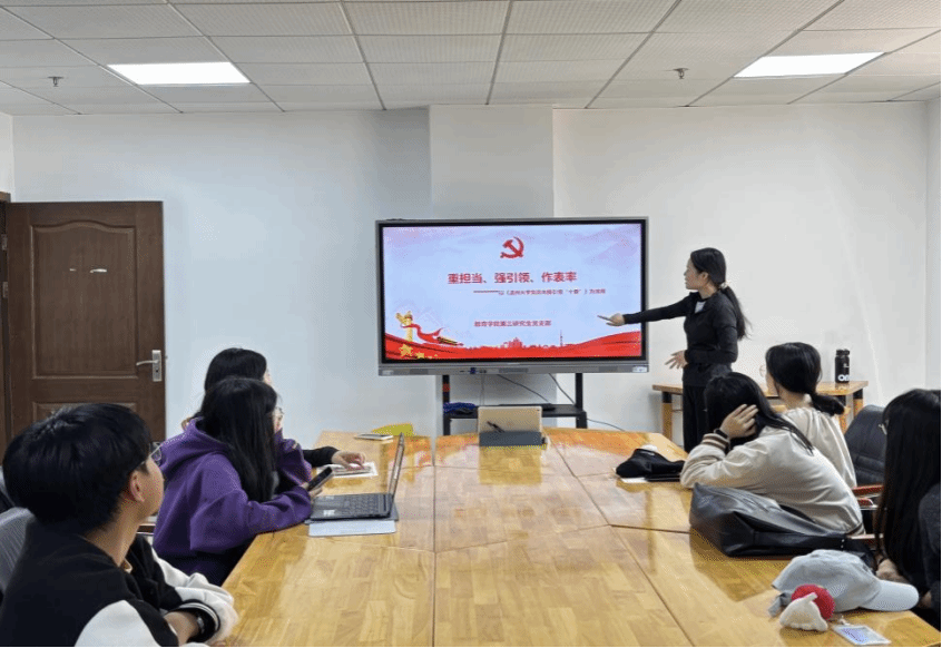 【泥巴影院 第四研究生党支部】2025年3月19日,泥巴影院 第四研究生党支部在党员之家开展“重担当、强引领、作表率”党日活动,由副书记叶碧滢主持,宣传委员张慧琳记录,全体29名党员均出席。活动围绕马克思主义宗教观、全国及全省高校党的建设工作会议和 “十要”通知开展理论学习。叶碧滢带领党员学习相关内容,强调贯彻党的宗教工作理论与政策,党员们签订抵制邪教承诺书,并明确在高校党建方面要做到五个带头。之后,孟晓培等四位同志分享寒假党员社会角色体验,如参与社区服务,大家借此探讨理论转化为行动的方法,增强社会责任感与团队凝聚力。最后,叶碧滢总结,指出“重担当、强引领、作表率”是党员必修课与信仰追求。