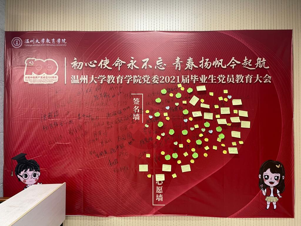 送一次祝福。何毅向各位毕业生党员送上了温馨的祝福,并分享了学校“光荣在党50年”纪念章颁发仪式。他鼓励全部毕业生党员:不忘入党初心,肩负党员时代重任;不忘教育初心,坚定人民教师信念;不忘奋斗初心,争立时代奋进潮头;不忘人生初心,保持平和乐观心态。他祝愿全体毕业生党员永葆入党初心,始终奋勇前行,争做新时代“四有”好老师,在平凡岗位上成就不平凡的人生!大家在便利贴上写下对党的祝福或自己的心愿,并落款姓名和入党时间,贴在心愿墙上,许下对未来的期许。学院也为各位毕业生党员悉心准备了精美的小礼品。