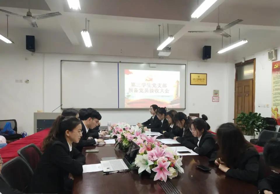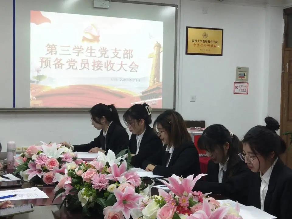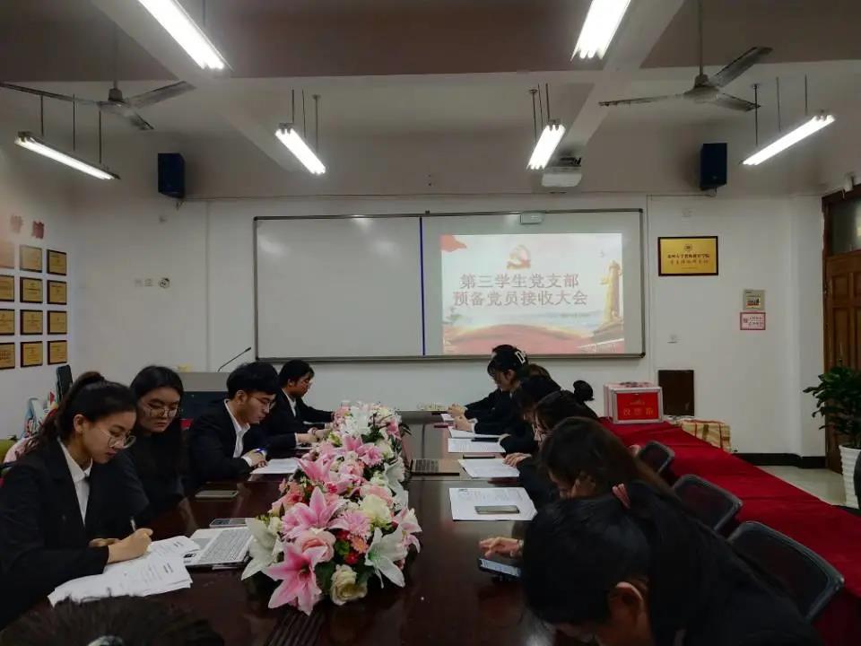 2021年3月19日,第三学生党支部中共预备党员接收大会在泥巴影院 党员之家举行,会议由党支部书记何奔奔同志主持,该支部全体党员参与此次会议。经党支部大会决议,一致同意接收虞星蕾、陈明月、盛伊诺、冯家宜、周希涵、顾雨培、郭润娟7名同志成为中共预备党员。