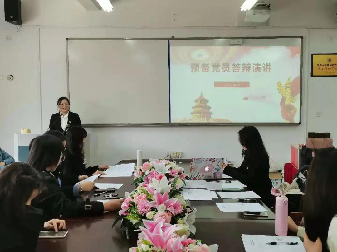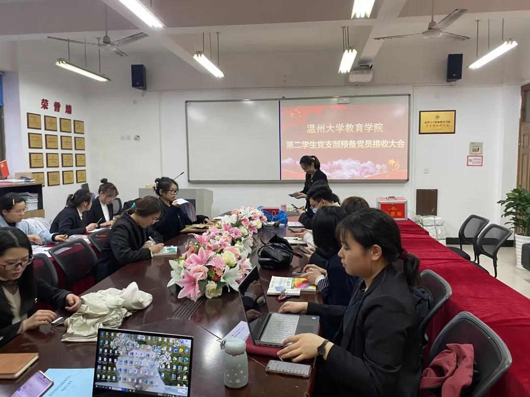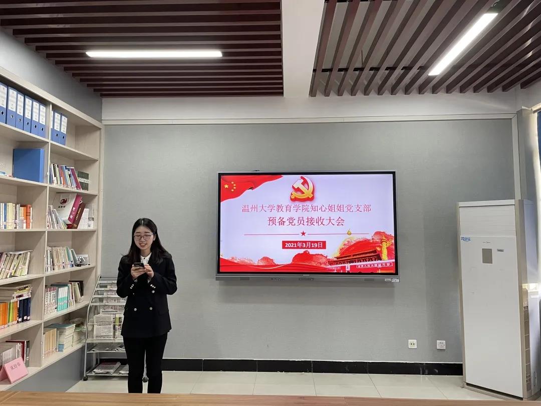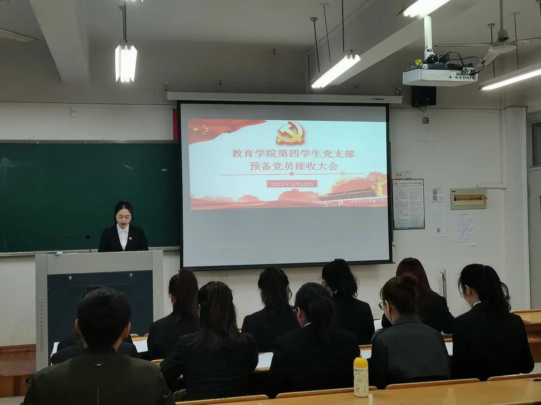 2021年3月19日,第四学生党支部中共预备党员接收大会在泥巴影院 B301举行,会议由党支部书记助理谢红同志主持,该支部全体党员参与此次会议。经党支部大会决议,一致同意接收黄雨霞、应俊鑫、周佳佳、方东欣、周绮阳、项静、徐诗琦、陈银燕、姜文静、吴晓晓、陈慧彬、蔡政倩12名同志成为中共预备党员。