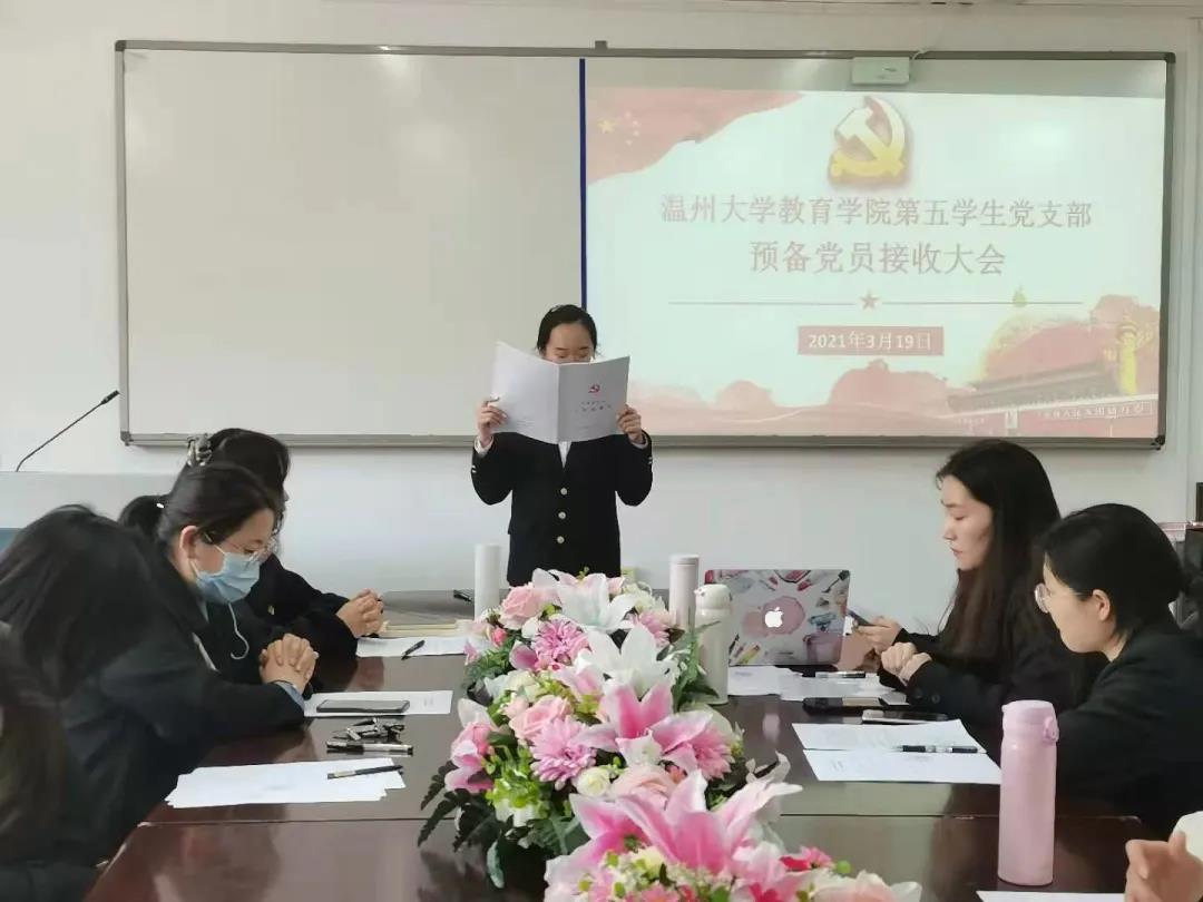 2021年3月19日,第五学生党支部中共预备党员接收大会在泥巴影院 党员之家举行,会议由周晨霏同志主持,该支部全体党员参与此次会议。经党支部大会决议,一致同意接收汤美萍、王亭亭、曹嘉芮、李柠、蔡婷美5名同志成为中共预备党员。