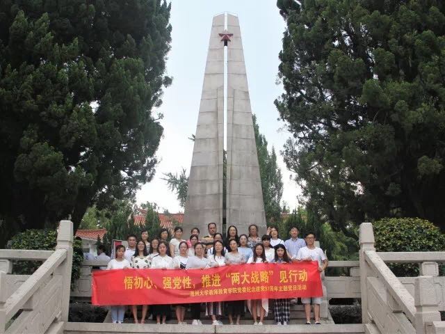 2018年6月29日下午,教师泥巴影院 组织师生党员赶赴江心屿,开展“悟初心、强党性,推进‘两大战略’见行动”的主题党日活动。在江心屿革命烈士纪念碑前,教工党员潘士杰与学生党员张乐代表学院为革命烈士献上花圈,在场党员同志默哀并鞠躬,表达对革命先烈的缅怀之情。在鲜红的党旗下,聂海燕同志带领各位党员同志重温入党誓词。学生党员阮郑醒、周文带领大家一起学习了毛泽东同志的《为人民服务》与习近平同志的《用党员的标准严格要求自己》两篇文章。学院党委书记杨立淮在革命烈士纪念碑前发表了讲话,他结合这两篇文章的学习指出,学院党组织和党员要始终牢记全心全意为人民服务的宗旨,在推进事业发展中要发挥好基层党组织战斗堡垒作用和党员先锋模范作用。最后,党员同志们在解说员的带领下参观革命纪念馆。党员同志们纷纷表示,应该继承先烈遗志,发扬革命传统,坚定理想信念,不忘初心,为党的事业奋斗。