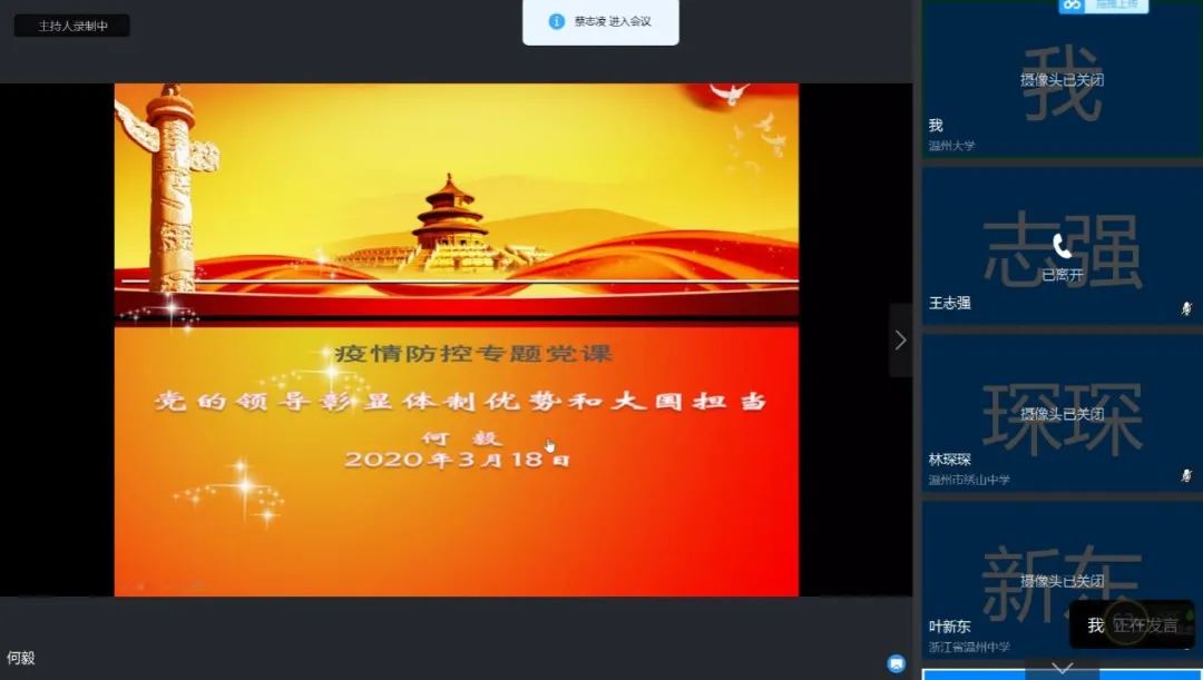 同时,何书记结合泥巴影院 师生共同参与战“疫”的先进事迹为大家点赞:教职工赖文华老师身在韩国,心系祖国,以个人名义向温州医院捐赠口罩;学院优秀学子积极报名,为战“疫”子女提供学业辅导;学院还开展了“以笔写'疫',思想同行”主题活动,引发强烈反响;学院老师还积极运用专业知识积极抗击疫情,开设实用课程回馈社会。何书记指出,目前正处于抗疫决战阶段,此次疫情既是挑战也是机遇,相信在党的坚强领导下,全国人民团结奋战,一定会全面战胜疫情,早日迎来春暖花开。