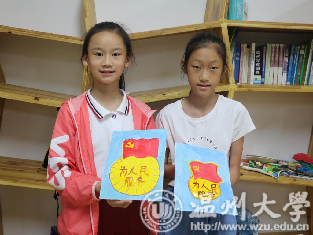 2019年是新中国成立的七十华诞,七月又是党的生日,在这特殊的日子里,“青愿逐梦”实践队不仅开展各类知识性和趣味性相结合的通识课程,带给孩子们充实快乐的暑假生活,还充分利用党群服务中心的红色背景和党员群众基础,开设了红色教育类特色课程。任课老师们历史导入课堂,讲授各类红色、时政小知识,孩子们都争着,抢着想要分享自己了解的建国、建党故事。而后是孩子们最喜爱的手工环节,绘制党徽、画一幅送给祖国母亲的画,孩子们用自己稚嫩的双手,一笔一画地画出了自己对祖国地爱意。助教和老师在孩子中忙地不亦乐乎,为孩子们洗笔、分发颜料,还有孩子们迫不及待地喊着:“老师,快教我写繁体字的‘未’!”画笔画下的,不仅是红与黄组成的党徽、国旗,也是孩子们对红船精神的理解,更是一颗在孩子们心中悄然种下的爱国种子。