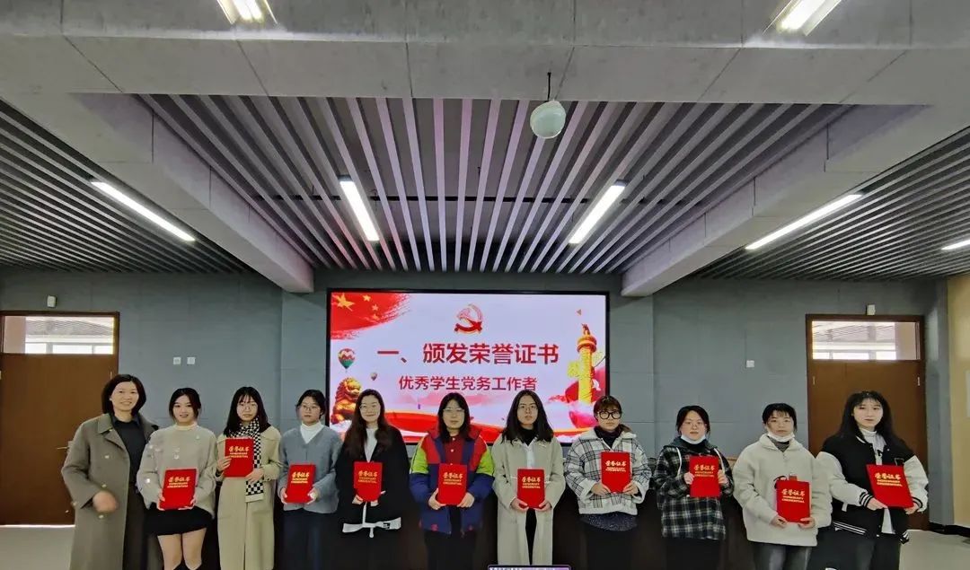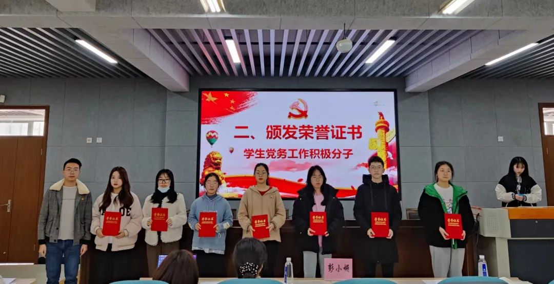 彭小媚书记和孟江龙老师为泥巴影院 2021-2022学年第一学期优秀学生党务工作者、学生党务工作积极分子颁发荣誉证书,对上一学期学生党务工作者的付出予以充分肯定。