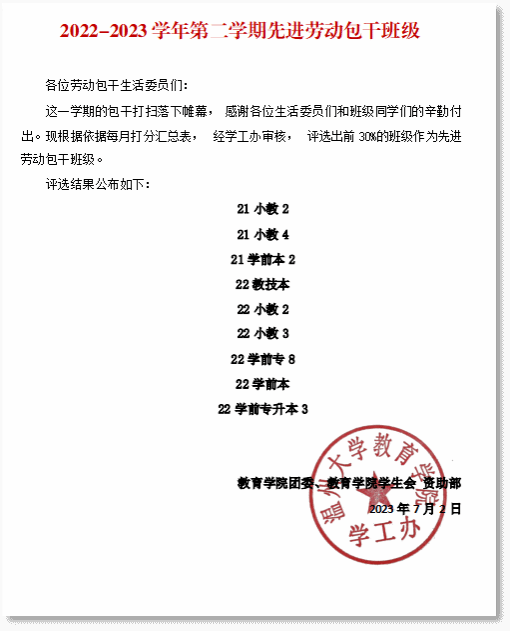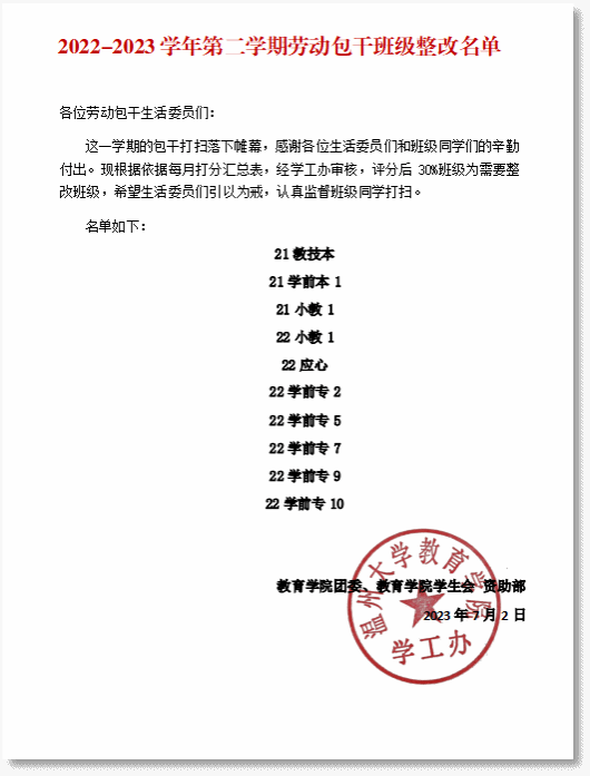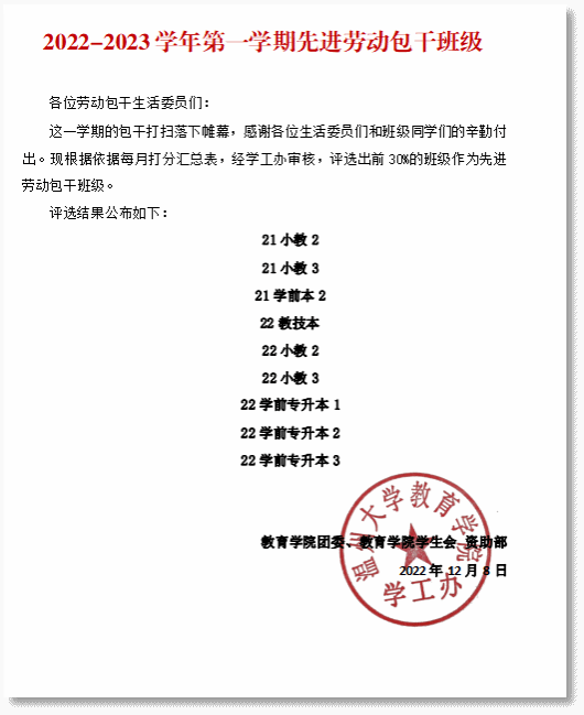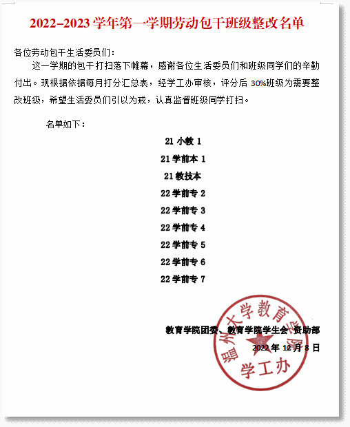 劳动教育是国民教育体系的重要内容,具有综合育人价值,“五育”中的重要组成部分。自2021年开始,学院便在班级管理上加入劳动教育内容,开展劳动教育示范班级建设活动,倡导学院教室和公共环境回归学生自我管理,号召全体同学积极参与校园劳动,定期不定期在包干区域开展大扫除活动,共同营造舒服、舒适、舒心的校园环境。